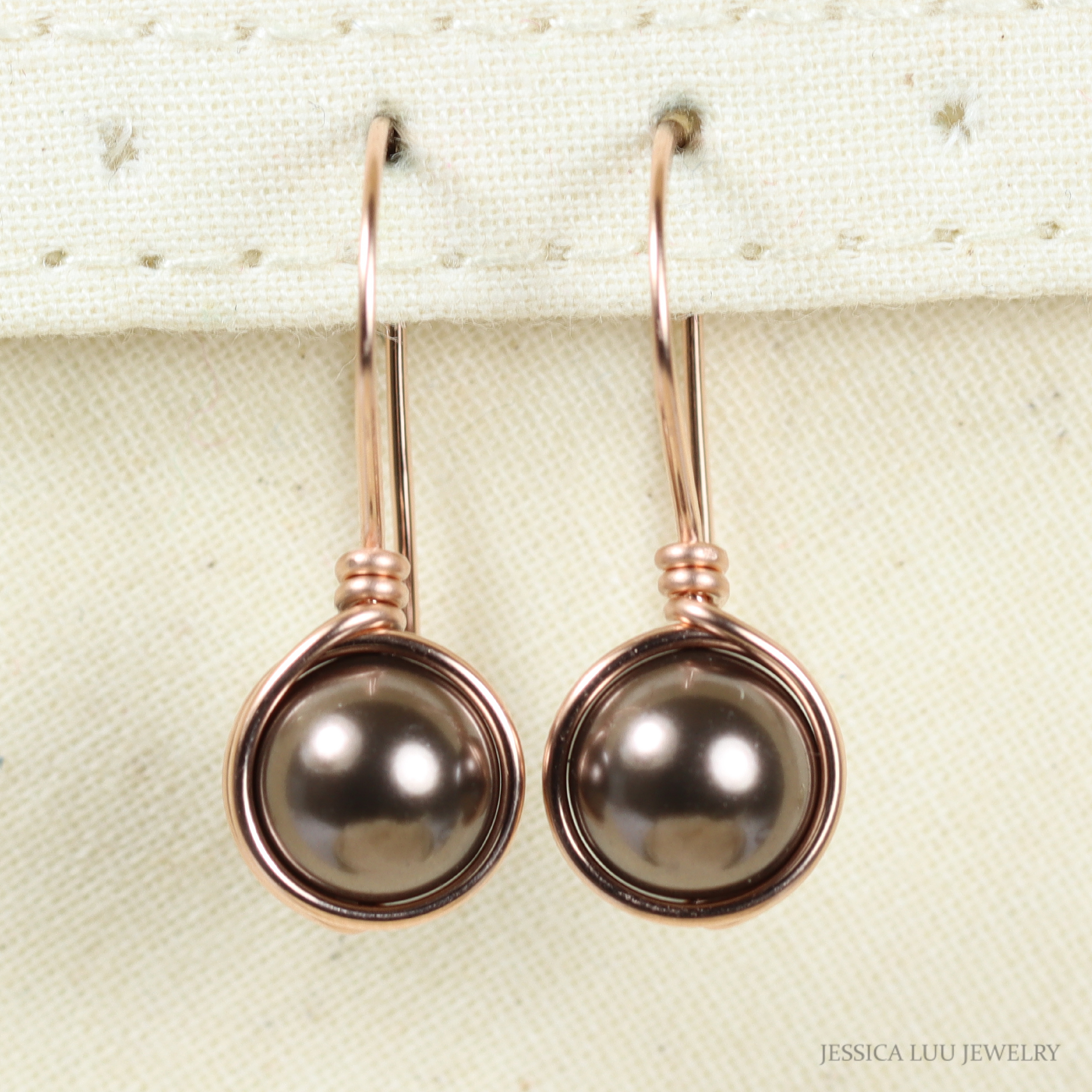 ~ EARRINGS DETAILS: 8mm dark chocolate brown crystal nacre pearl drop earrings in 14K rose gold filled wire wrapped setting and hook ear wires - about 1 inch long