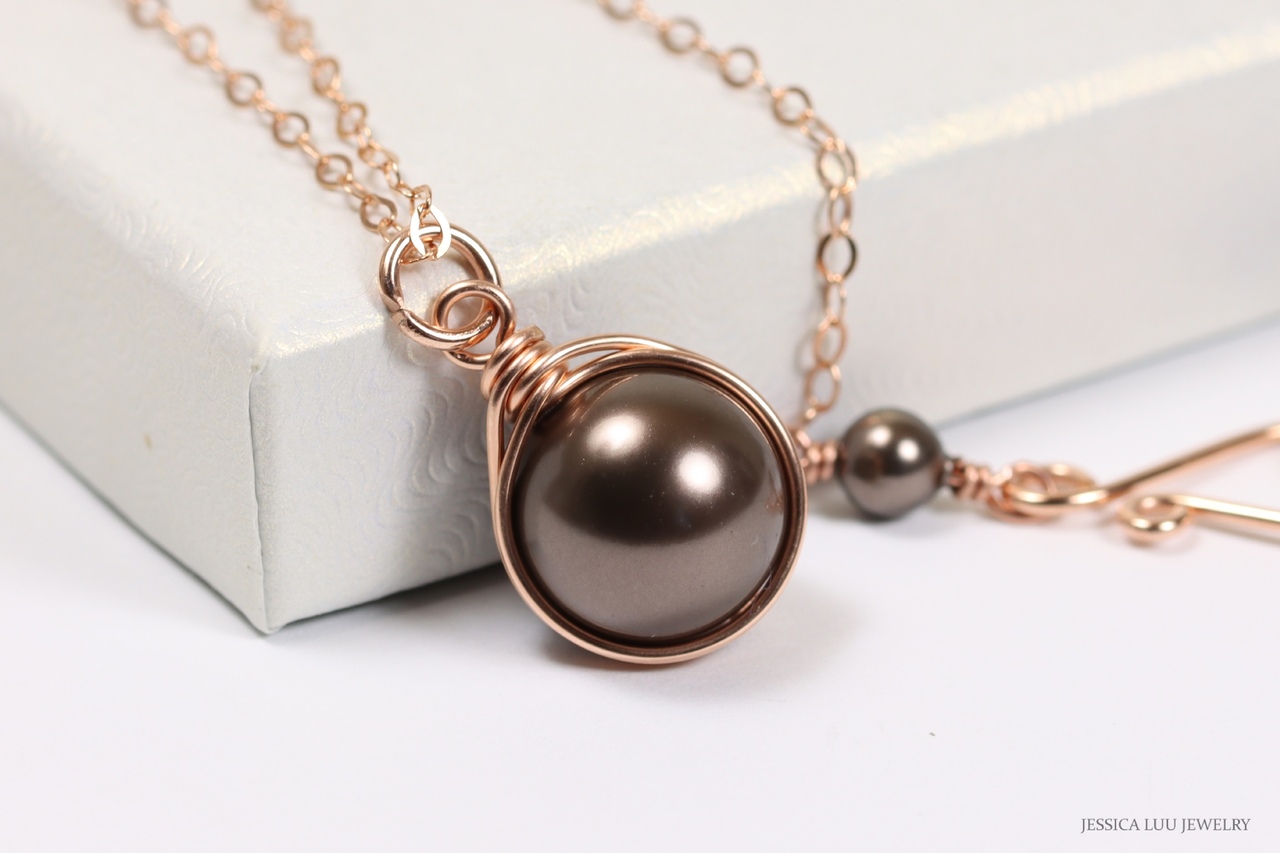 ~ NECKLACE DETAILS: 10mm dark chocolate brown crystal nacre pearl solitaire in 14K rose gold filled wire wrapped setting and hung on 18 inch long 14K rose gold filled chain necklace with hook and eye clasp