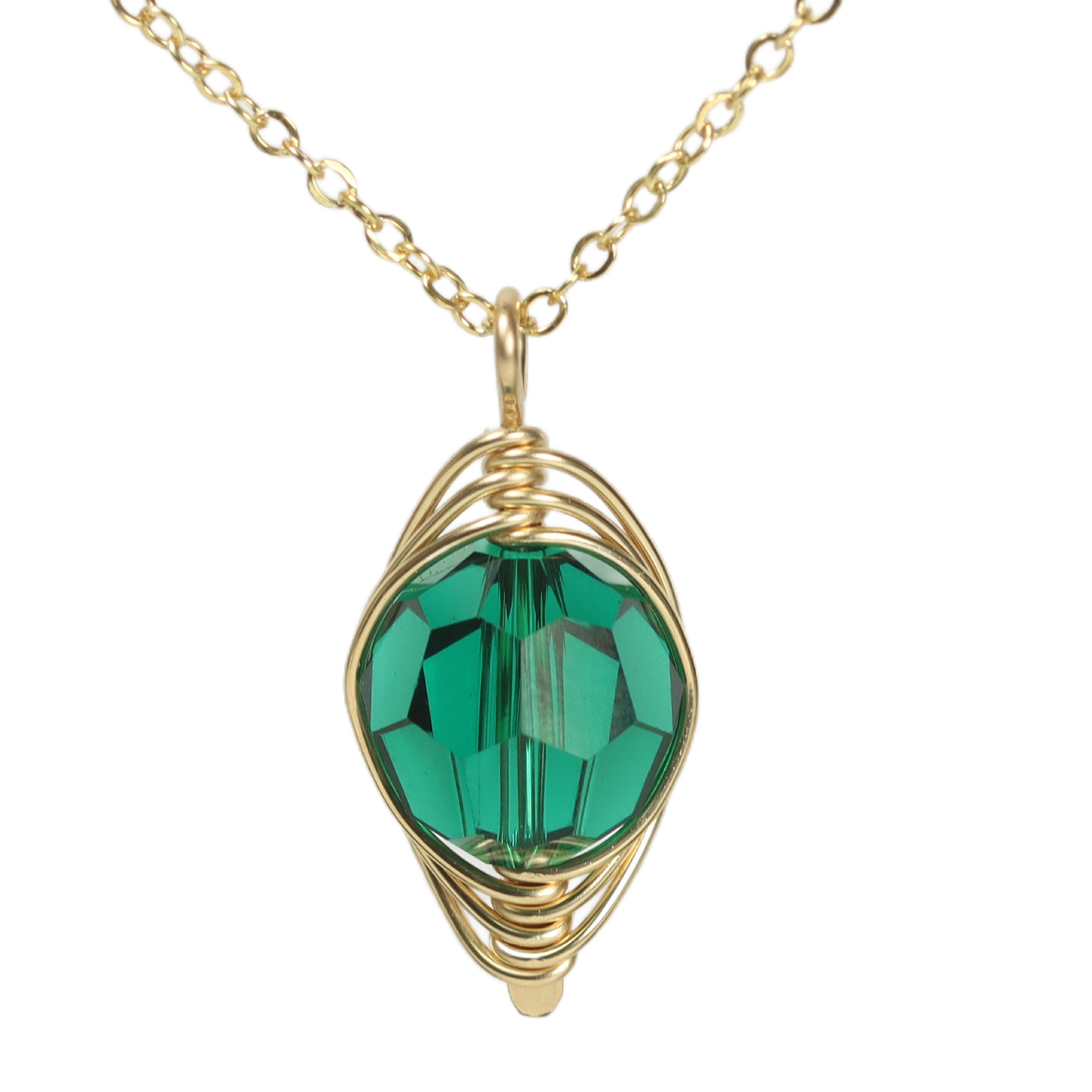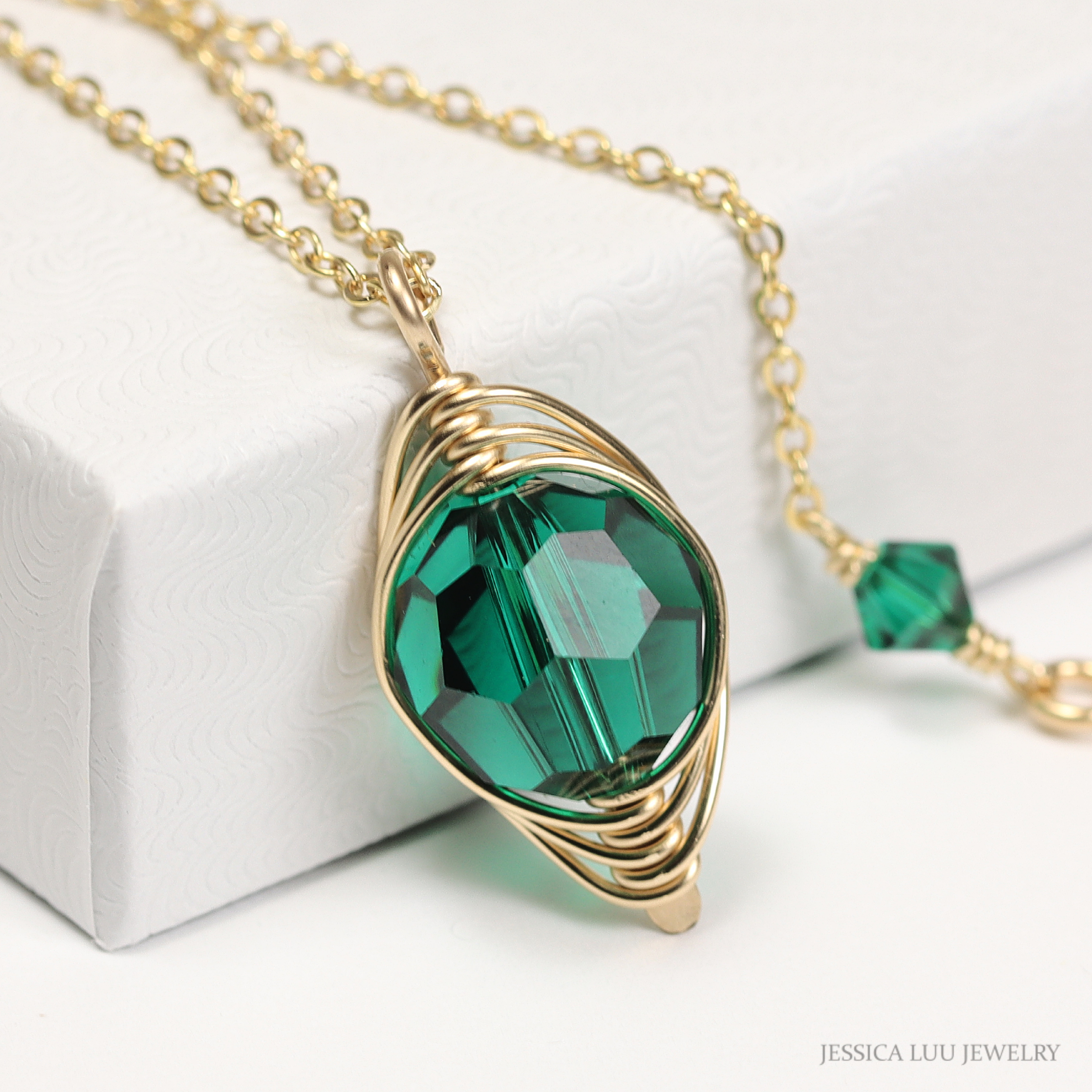 ~ Elegant Design: This pendant features a 10mm faceted round emerald green Austrian crystal solitaire wrapped in a herringbone style 14K yellow or rose gold filled wire.