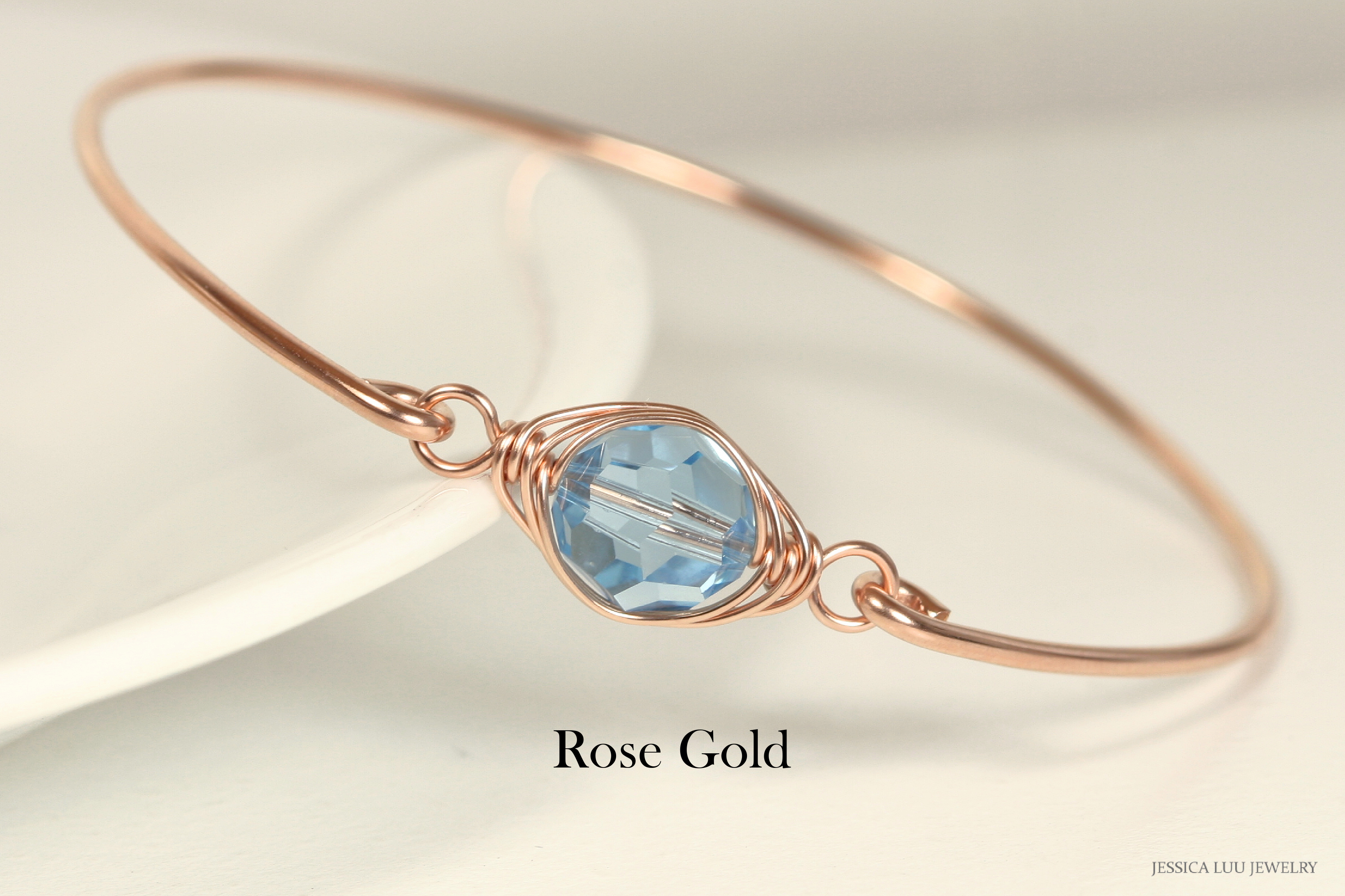 With every wave of your hand, there will be a sparkle of aqua blue at your wrist as this bangle moves around. Aquamarine is March’s birthstone.
