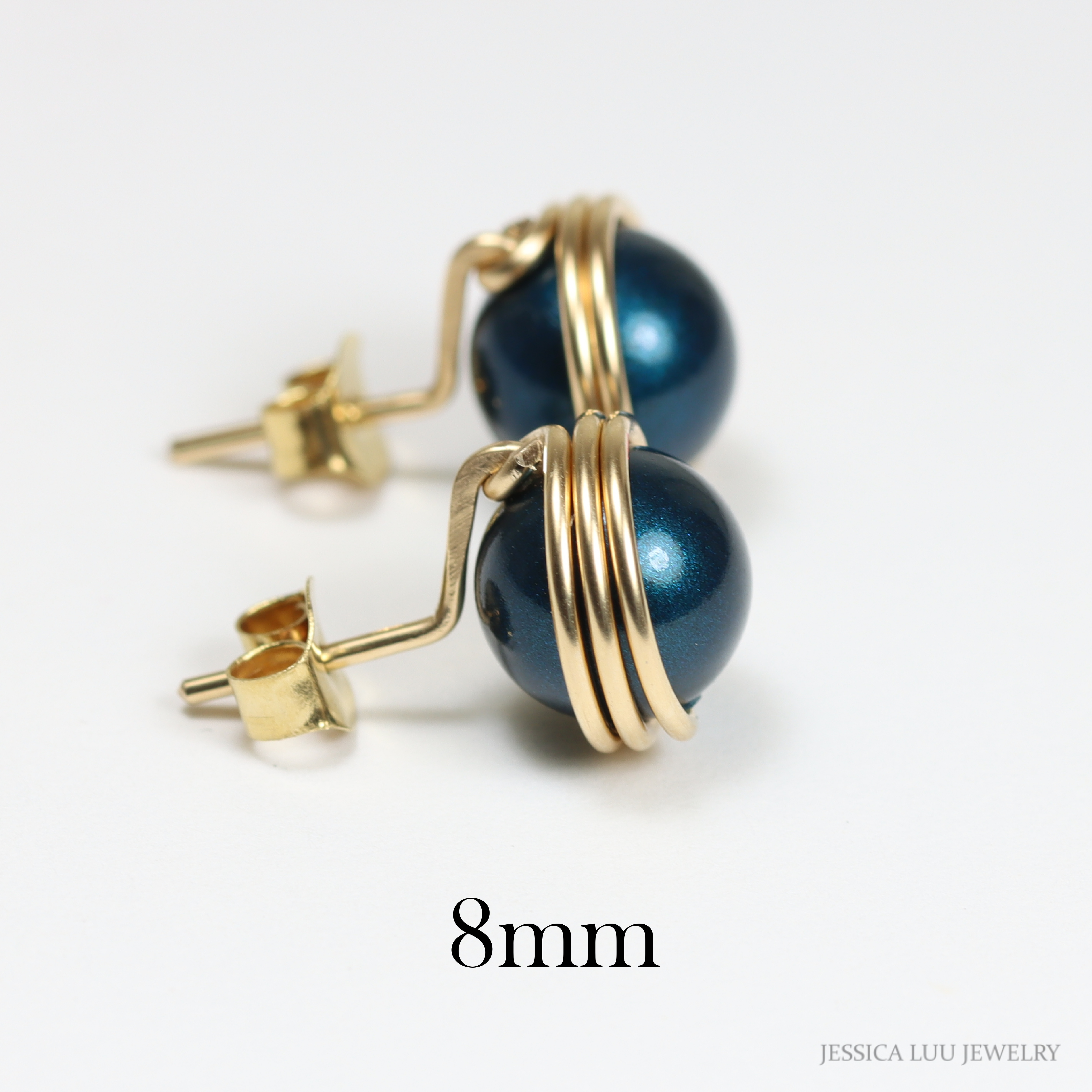 Dark Blue Pearl Stud Earrings Handmade by Jessica Luu Jewelry