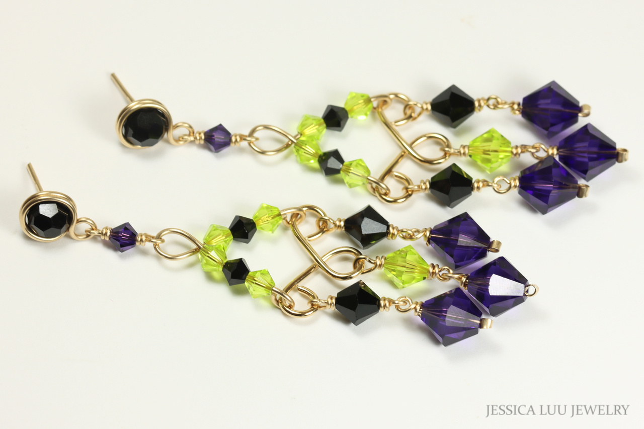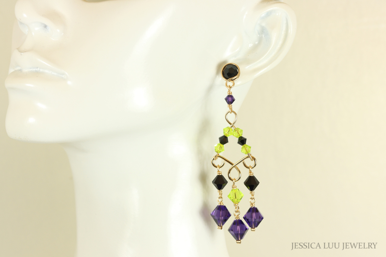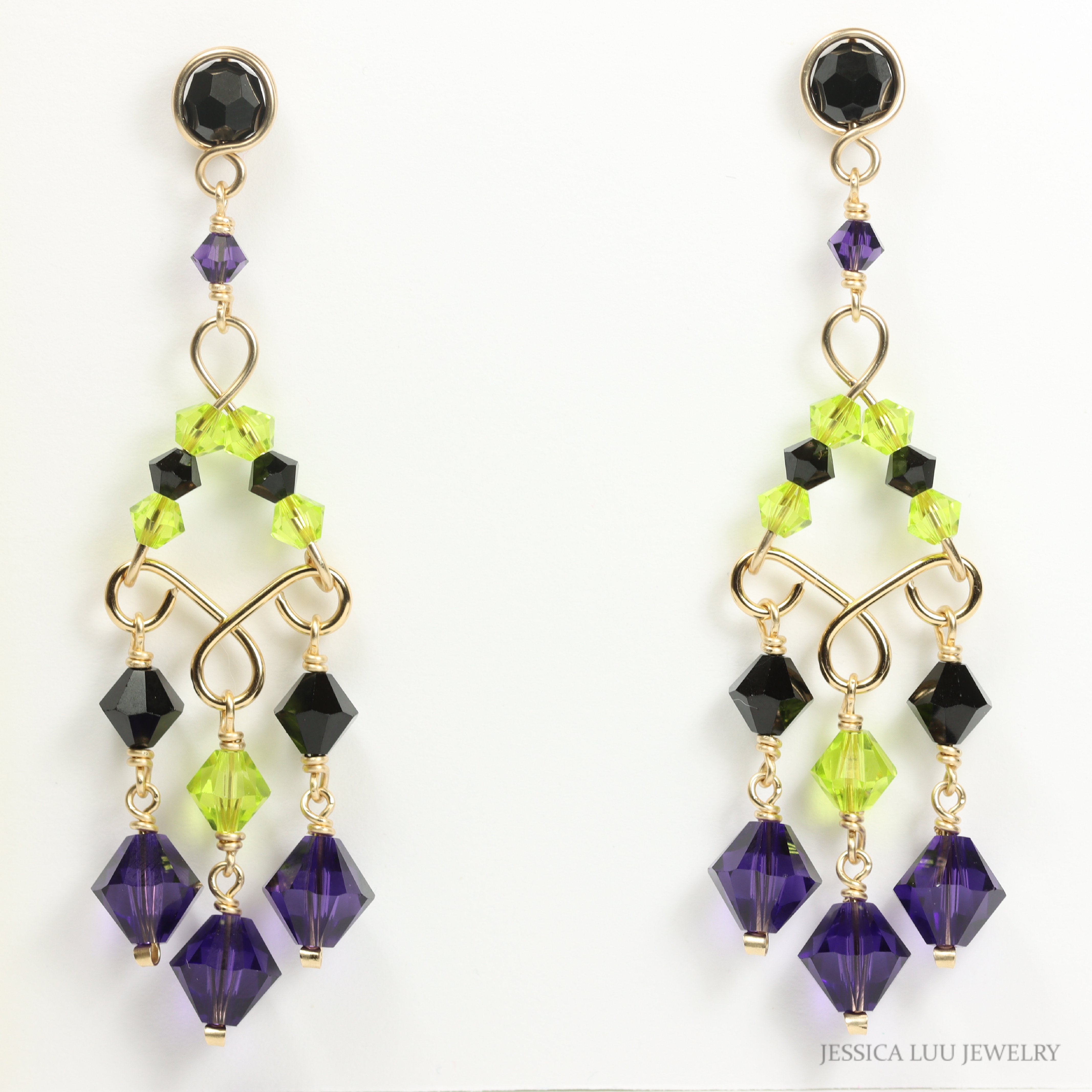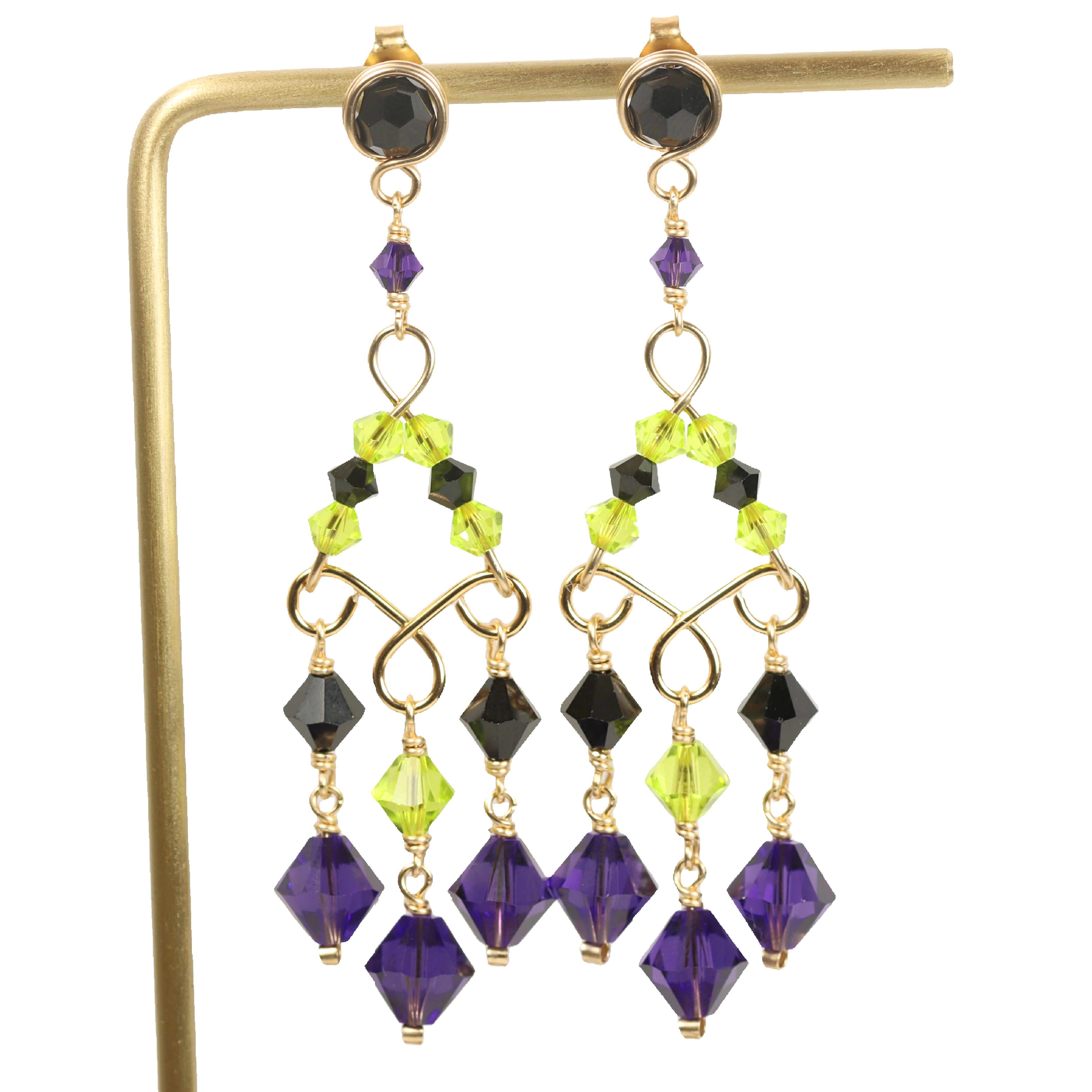 ~ Exquisite Craftsmanship: Handmade 14K yellow gold filled chandelier earrings featuring dark purple, black, and chartreuse green Austrian crystals.