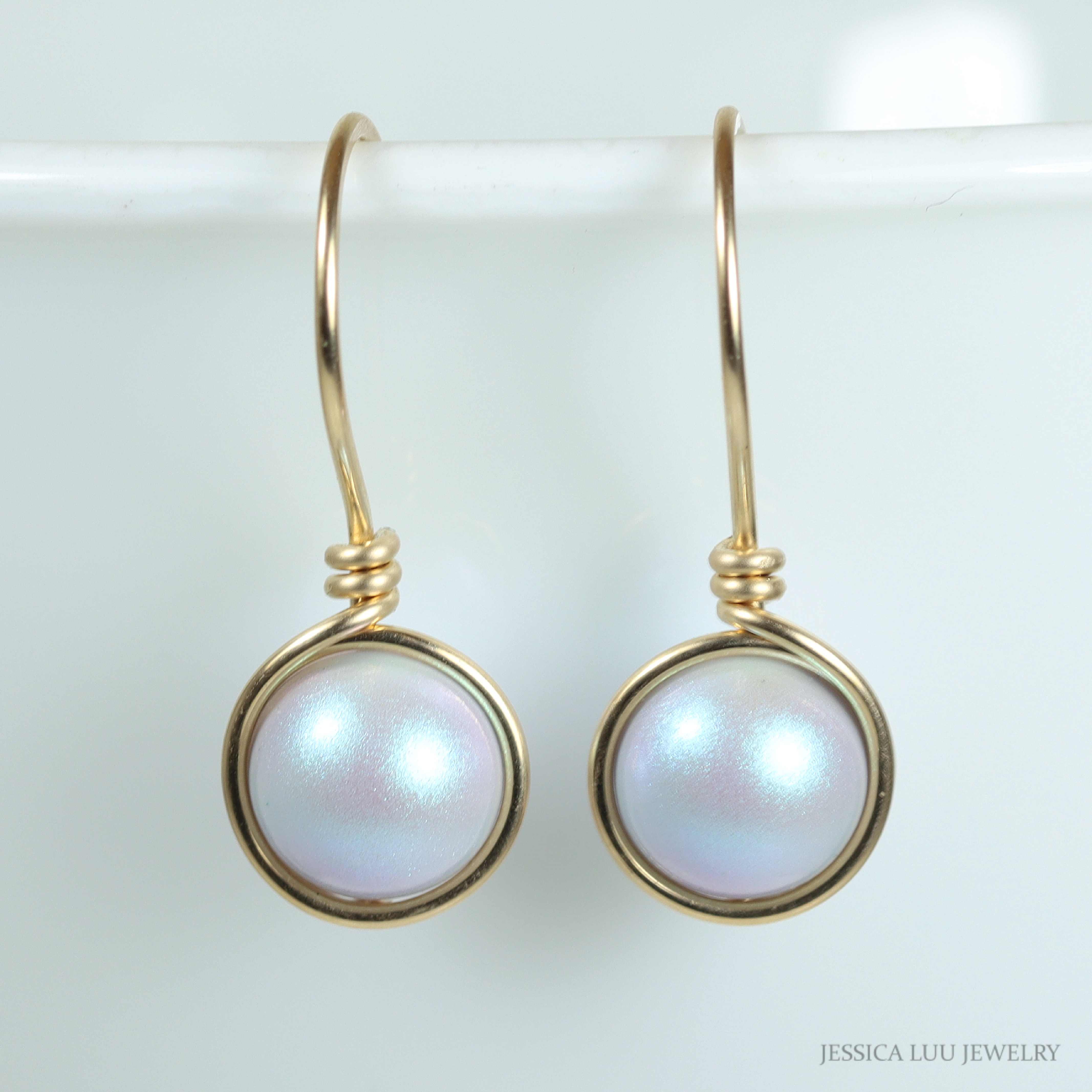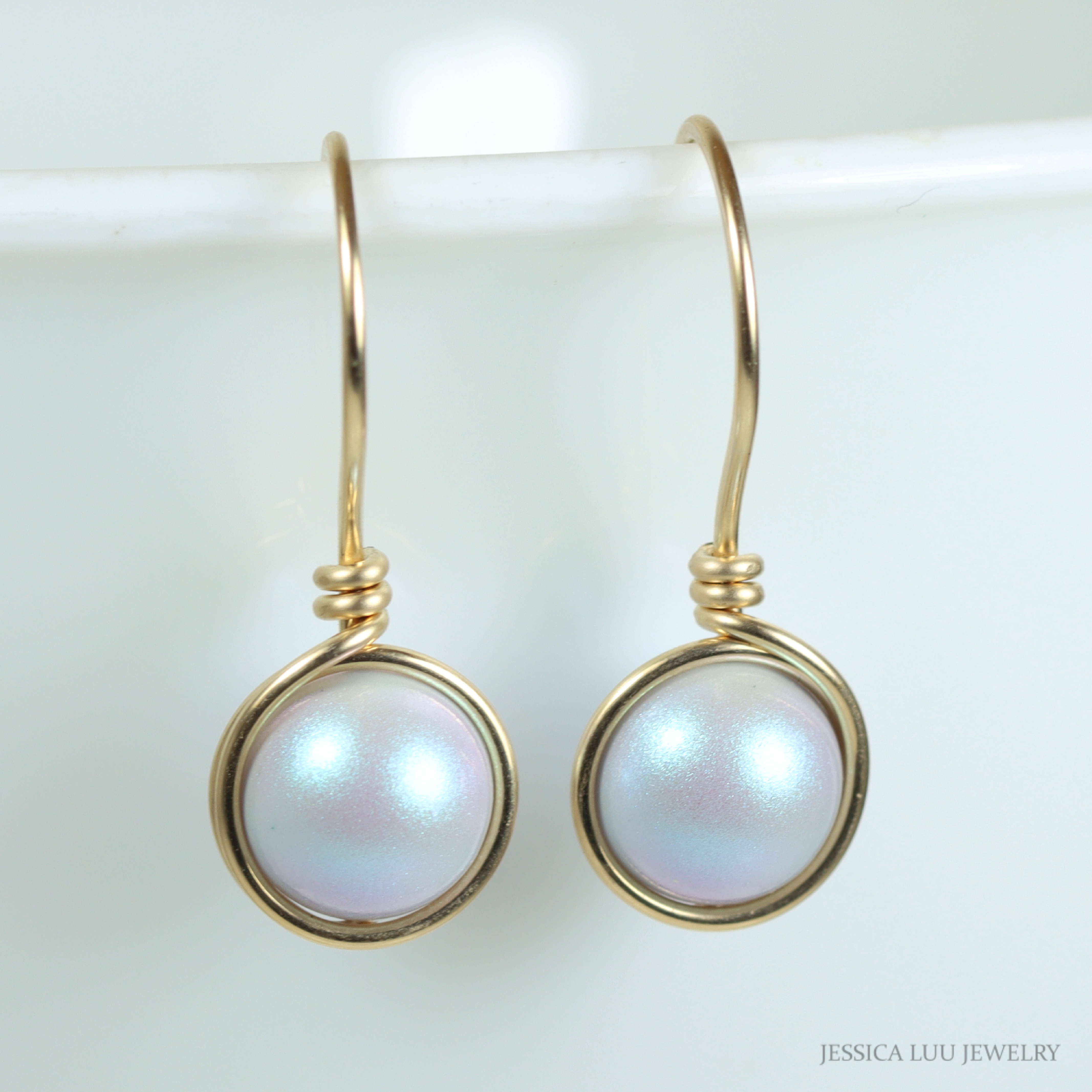 Each pearl is wrapped by hand with 14K gold filled wire which is then formed into the ear wire and hammered for strength. Gold filled wire is a hollow tube of 14 karat gold that is filled with brass for durability, so all the metal outside is 14K gold; gold filled wire will not wear off like gold plating and will last a lifetime.