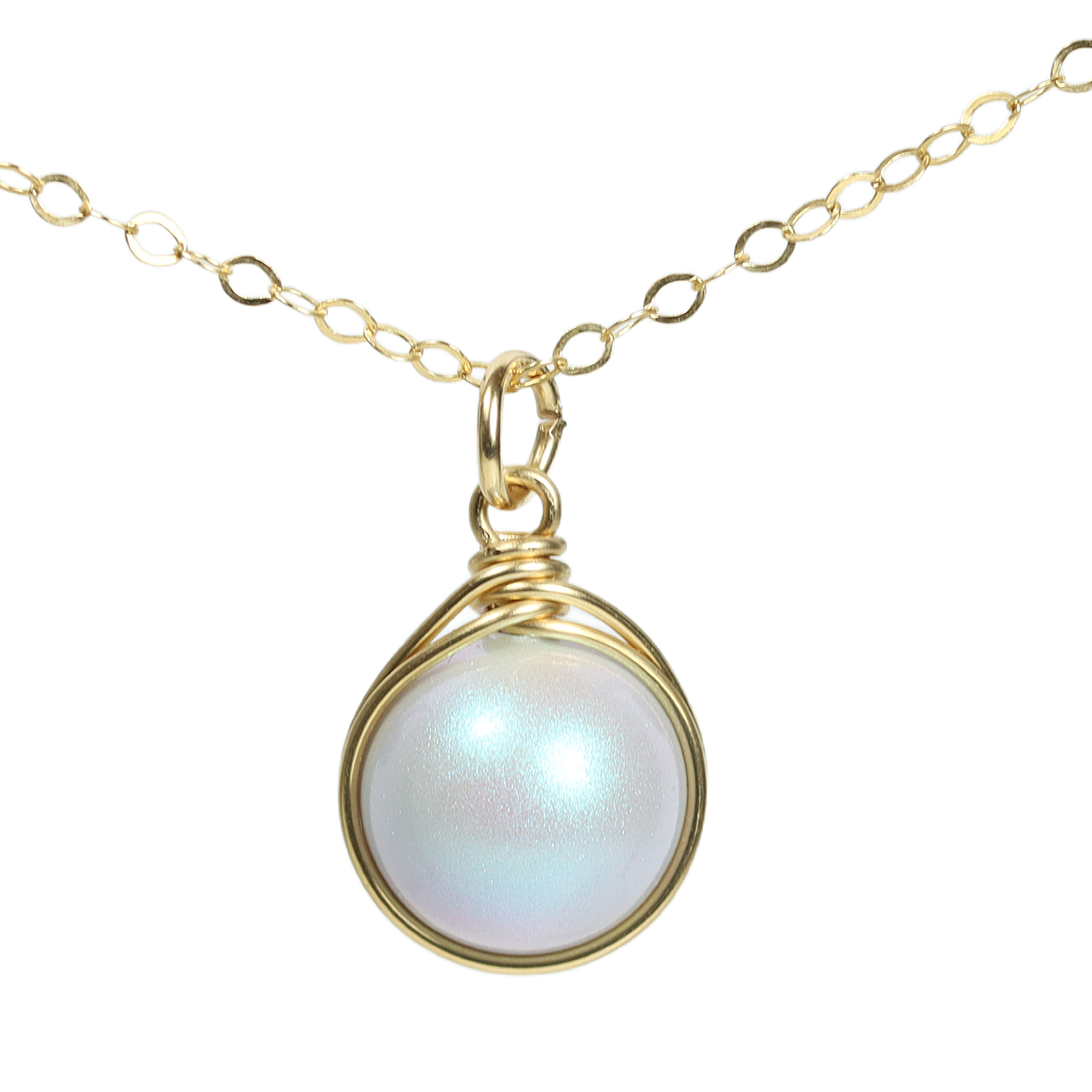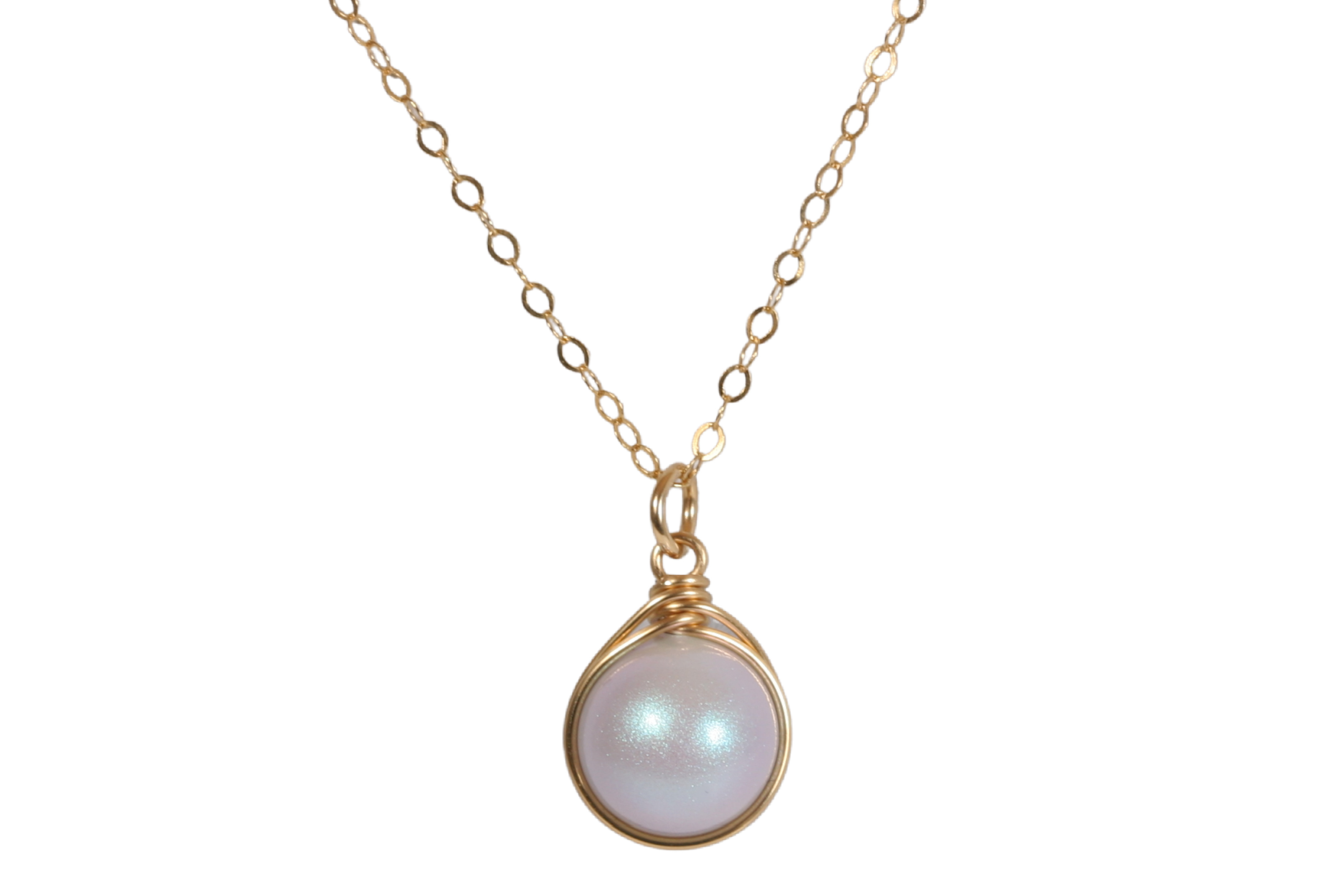 HOW IT’S MADE: A large round nacre pearl is wire wrapped by hand with 14K gold filled wire and hung from a delicate chain. Gold filled wire is a hollow tube of 14 karat gold that is filled with brass for durability, so all the metal outside is 14K gold; gold filled wire will not wear off like gold plating and will last a lifetime.