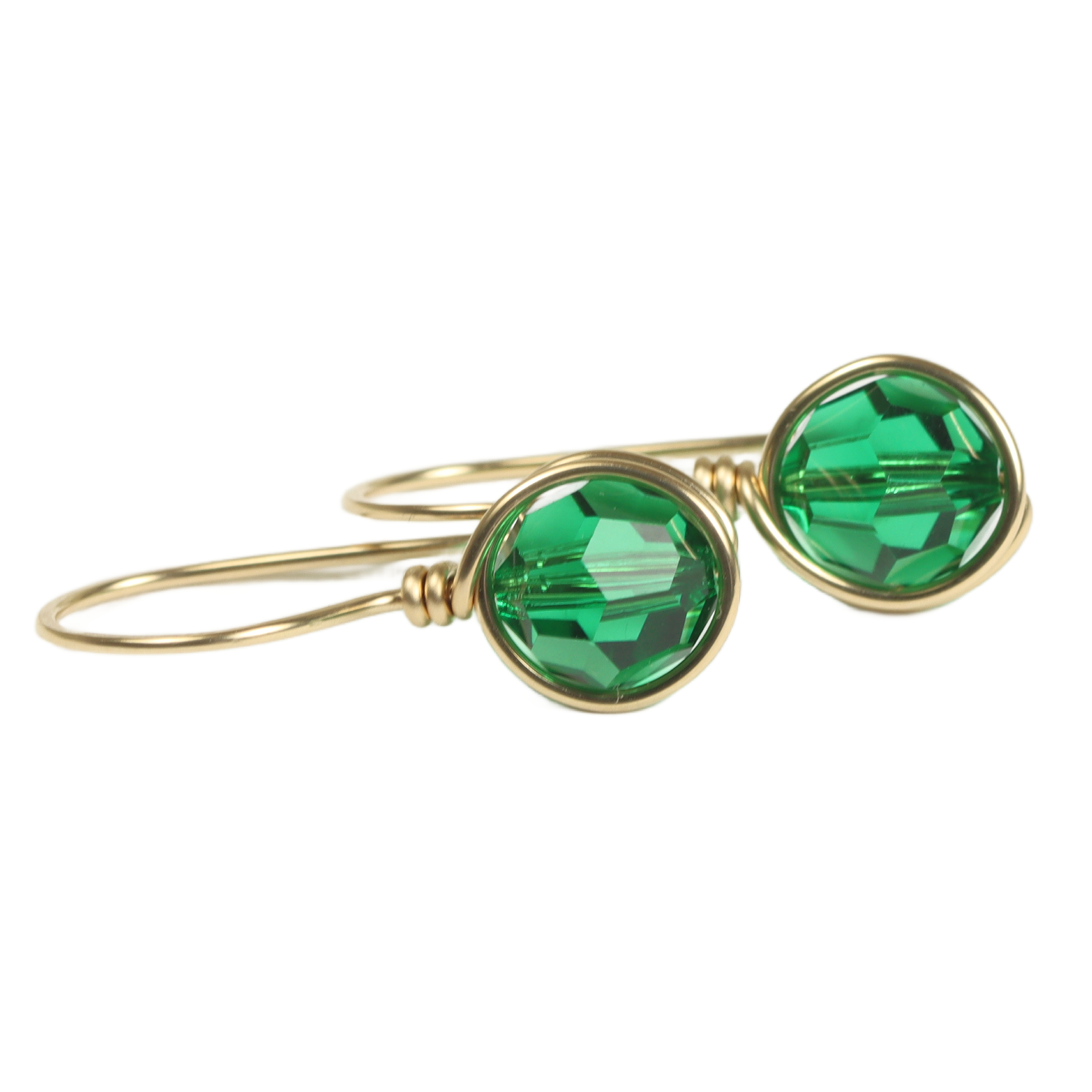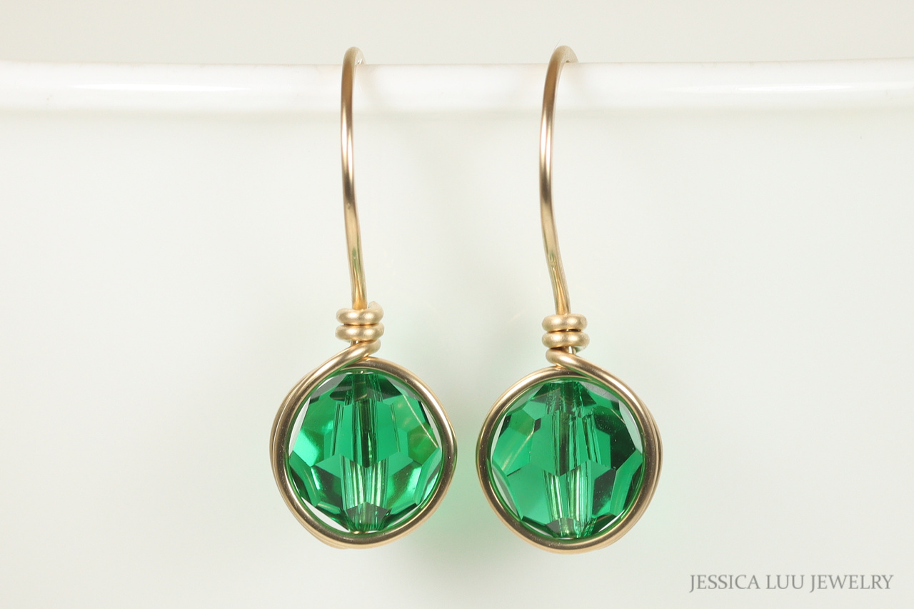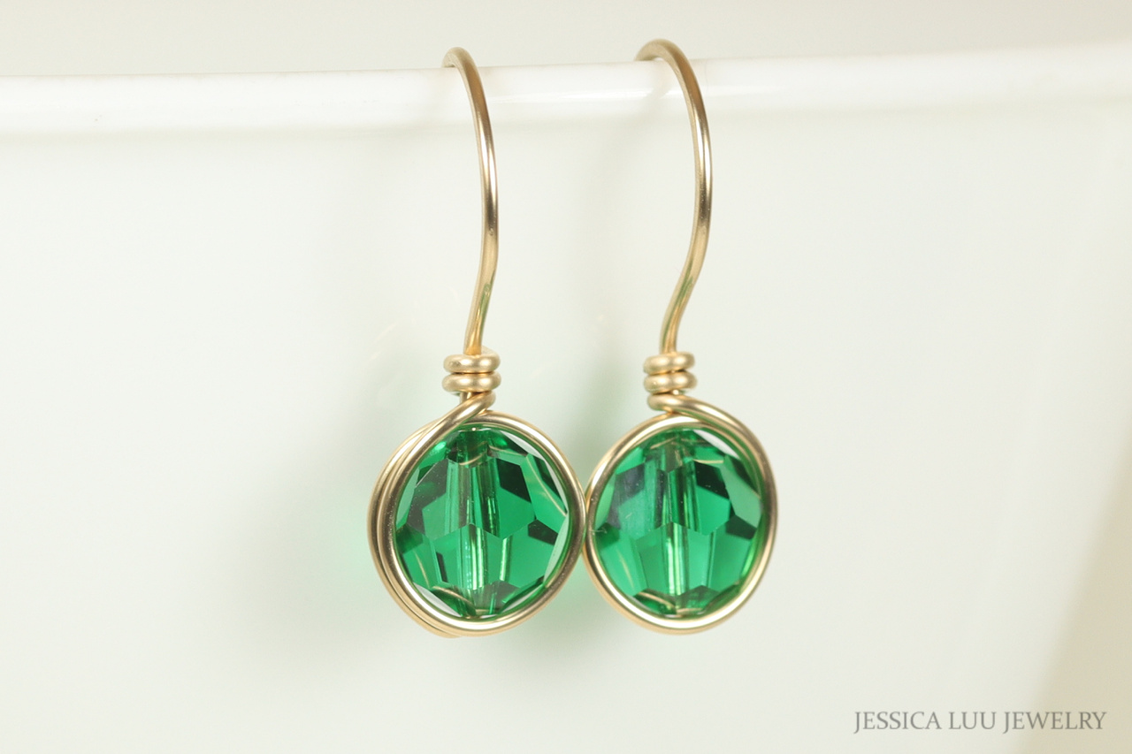 8mm jade green faceted round Austrian crystal drop earrings. Crafted with 14K yellow or rose gold filled wire, these handmade earrings by Jessica Luu Jewelry exude elegance and sophistication. The vibrant green crystals catch the light beautifully, adding a touch of glamour to any outfit. These lightweight earrings are perfect for everyday wear or special occasions, ensuring you look and feel your best. Their classic design and high-quality materials make them a timeless accessory you'll treasure for years to come. Embrace the beauty of these stunning earrings and let them be the highlight of your jewelry collection.