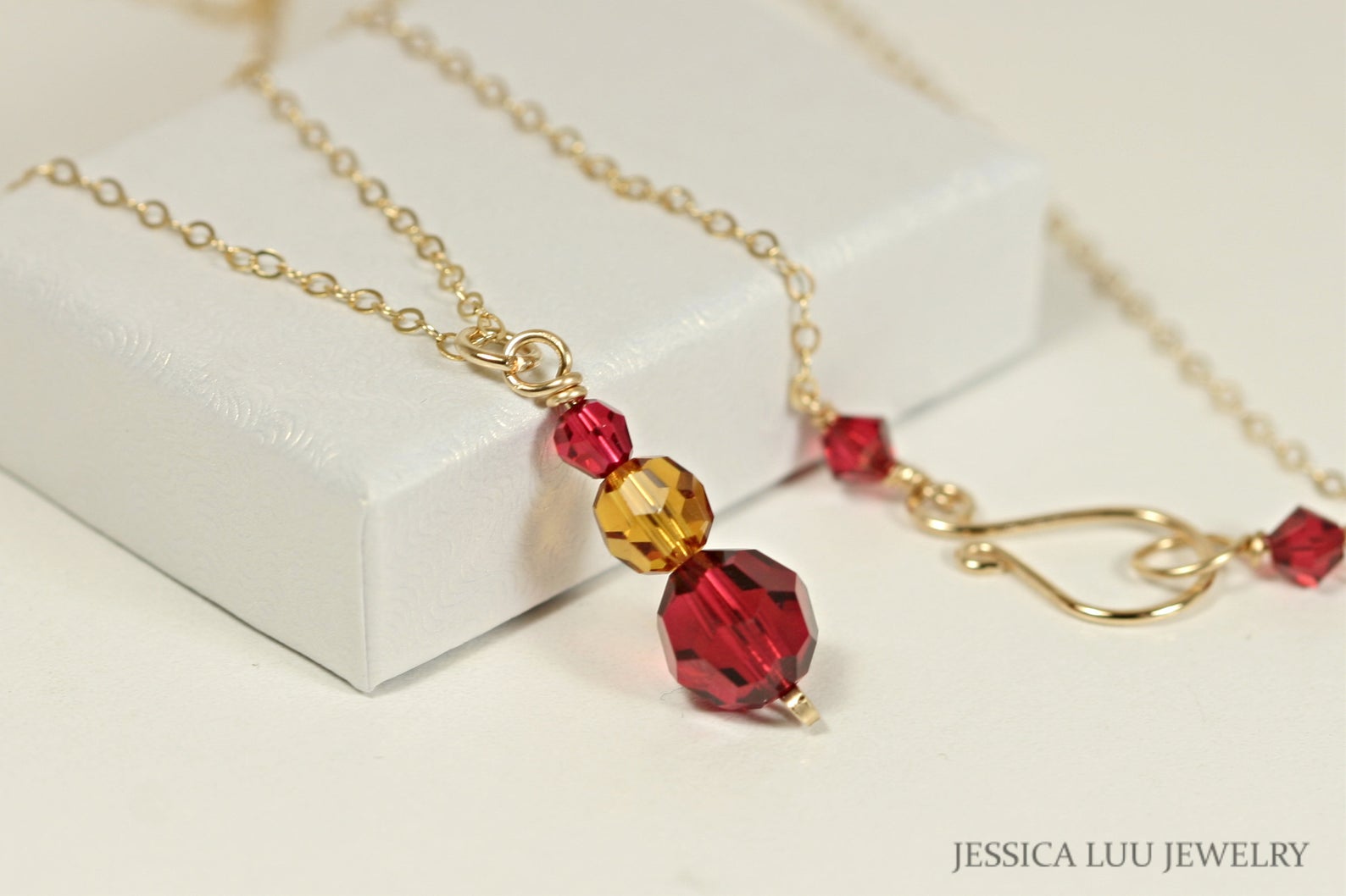 Gold Scarlet and Topaz Crystal Necklace Handmade by Jessica Luu Jewelry