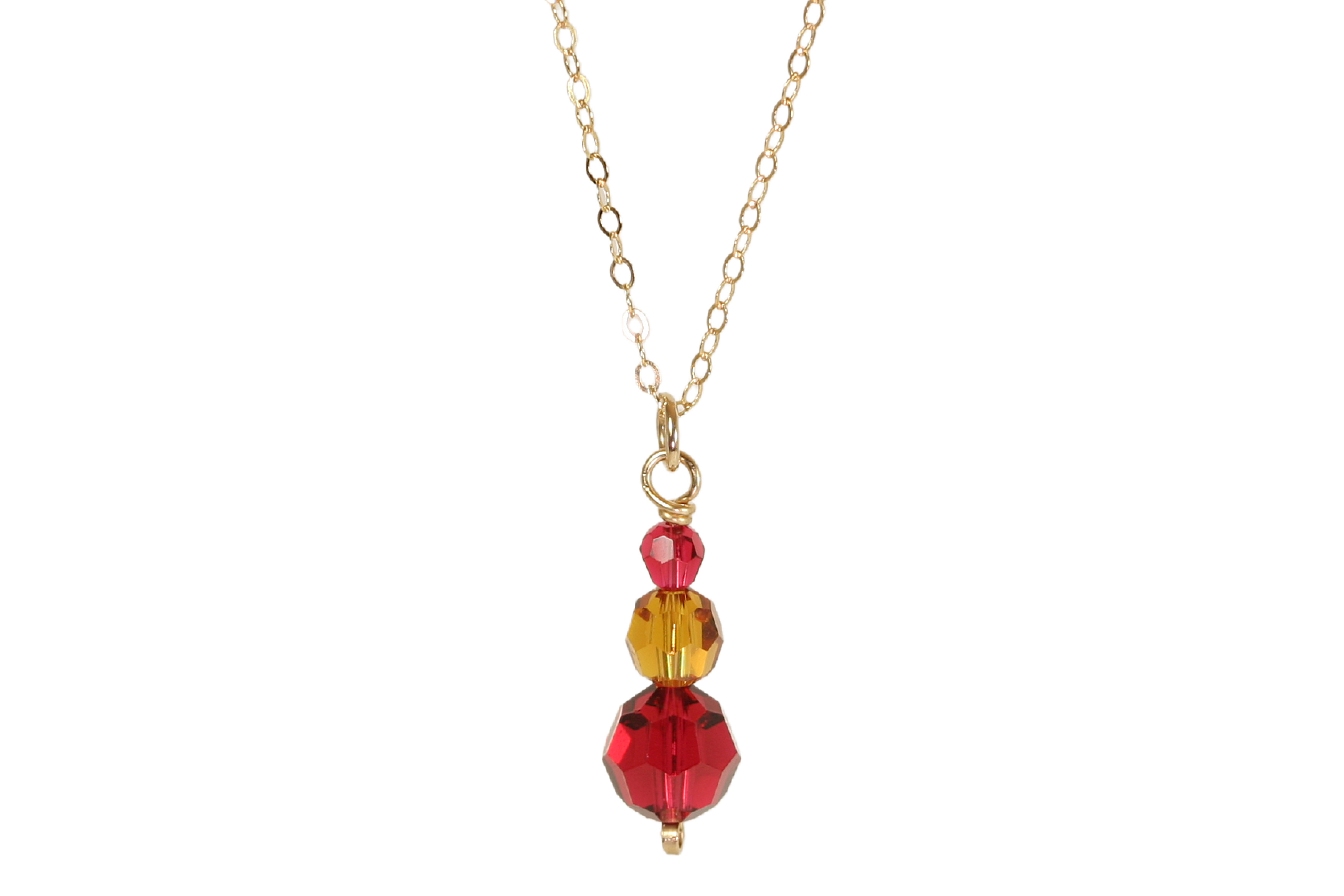 HOW IT’S MADE: 3 round crystals are threaded with 14K gold filled wire and hung from a delicate chain. Gold filled wire is a hollow tube of 14 karat gold that is filled with brass for durability, so all the metal outside is 14K gold; gold filled wire will not wear off like gold plating and will last a lifetime.