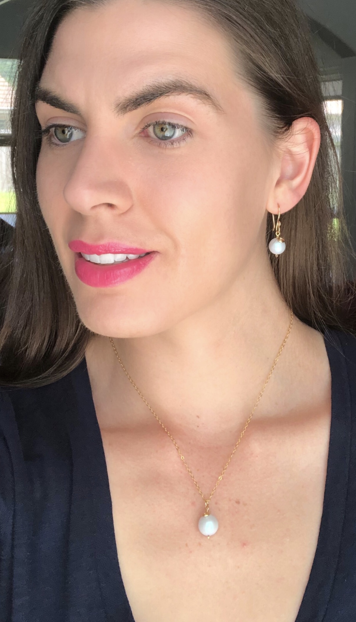 A swirl of gold compliments the large pearl in this handmade necklace - available with matching earrings.