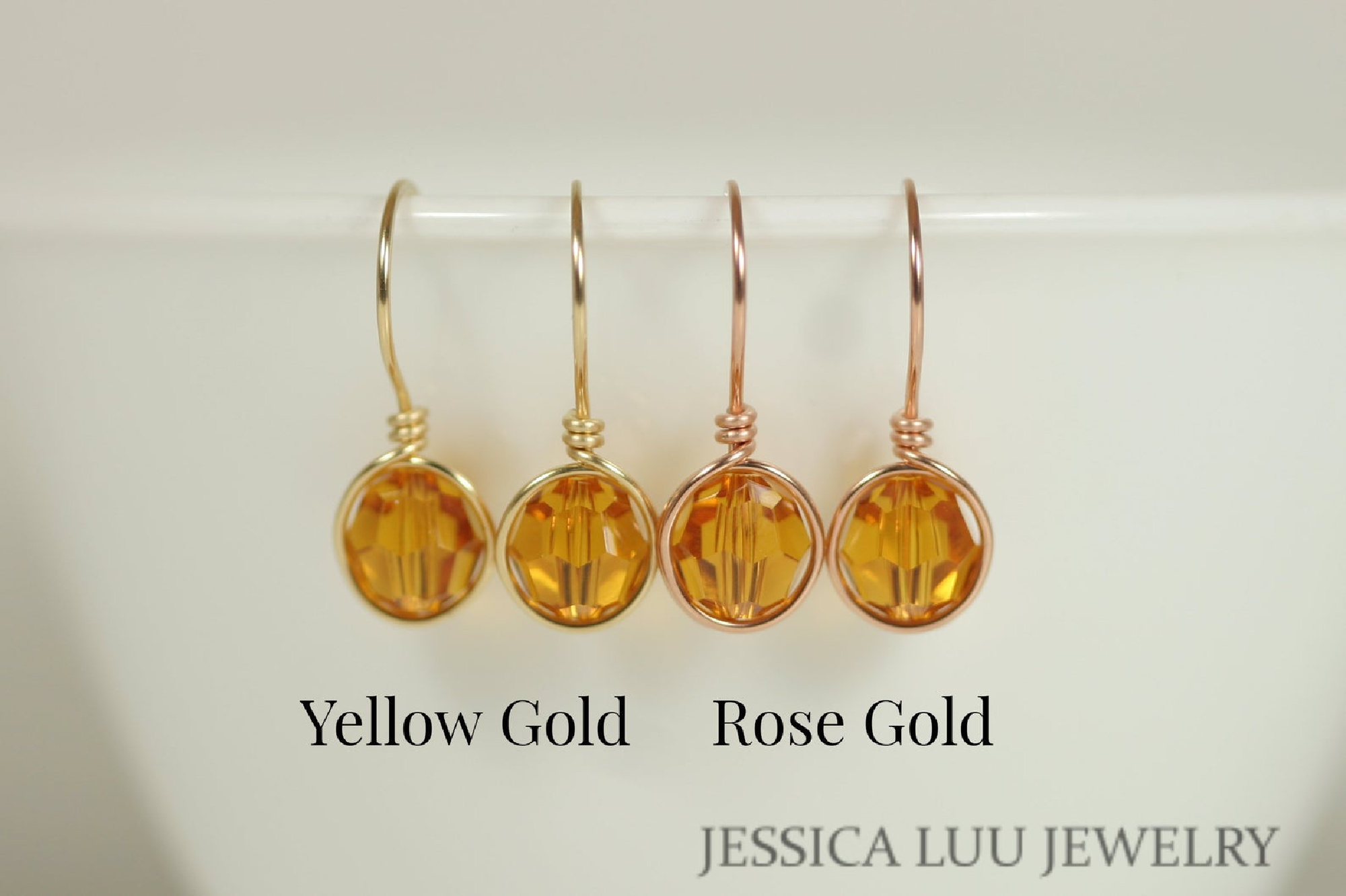 HOW THEY’RE MADE: 3 round crystals are threaded with 14K gold filled wire and hung from a delicate 14 karat gold filled chain. Gold filled wire is a hollow tube of 14 karat gold that is filled with brass for durability, so all the metal outside is 14K gold; gold filled wire will not wear off like gold plating and will last a lifetime.