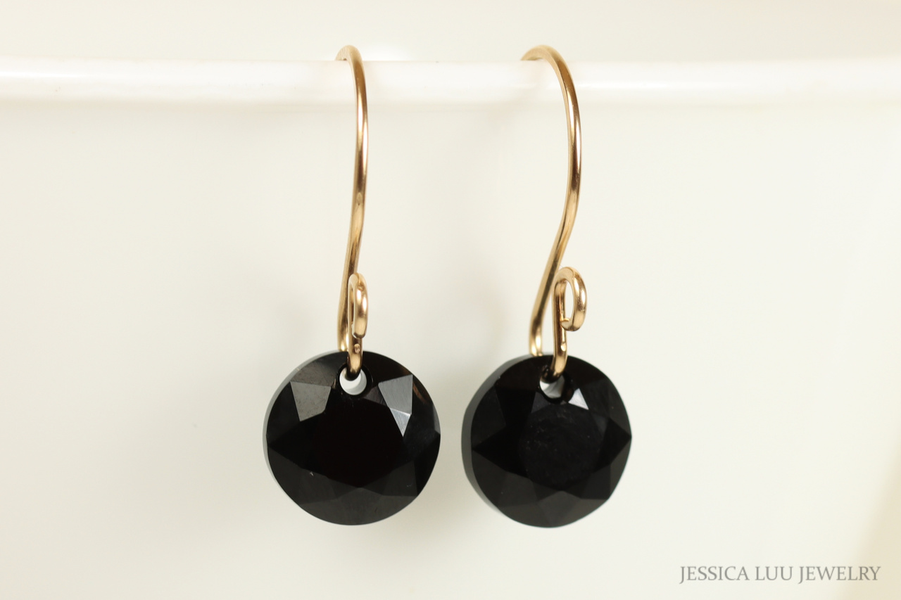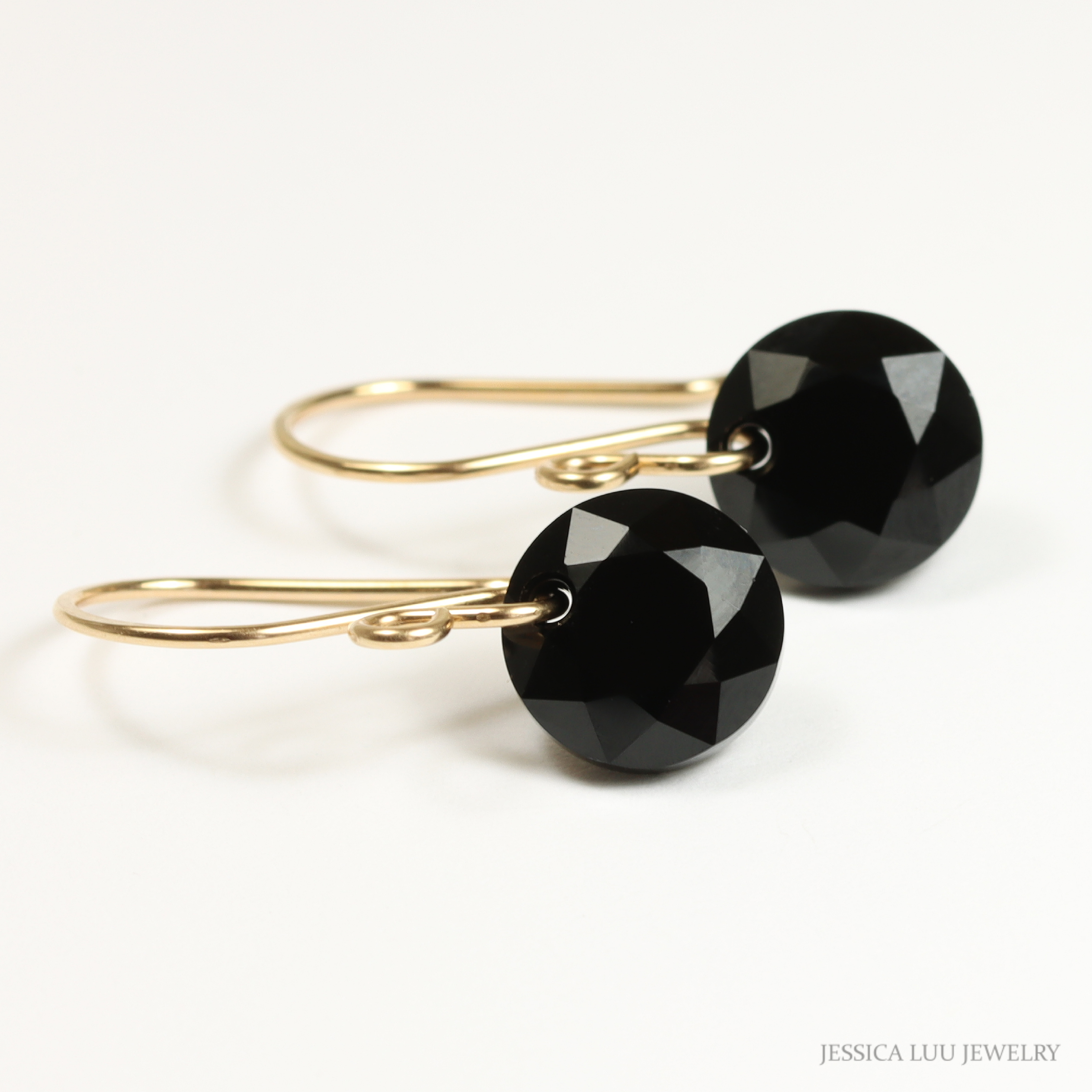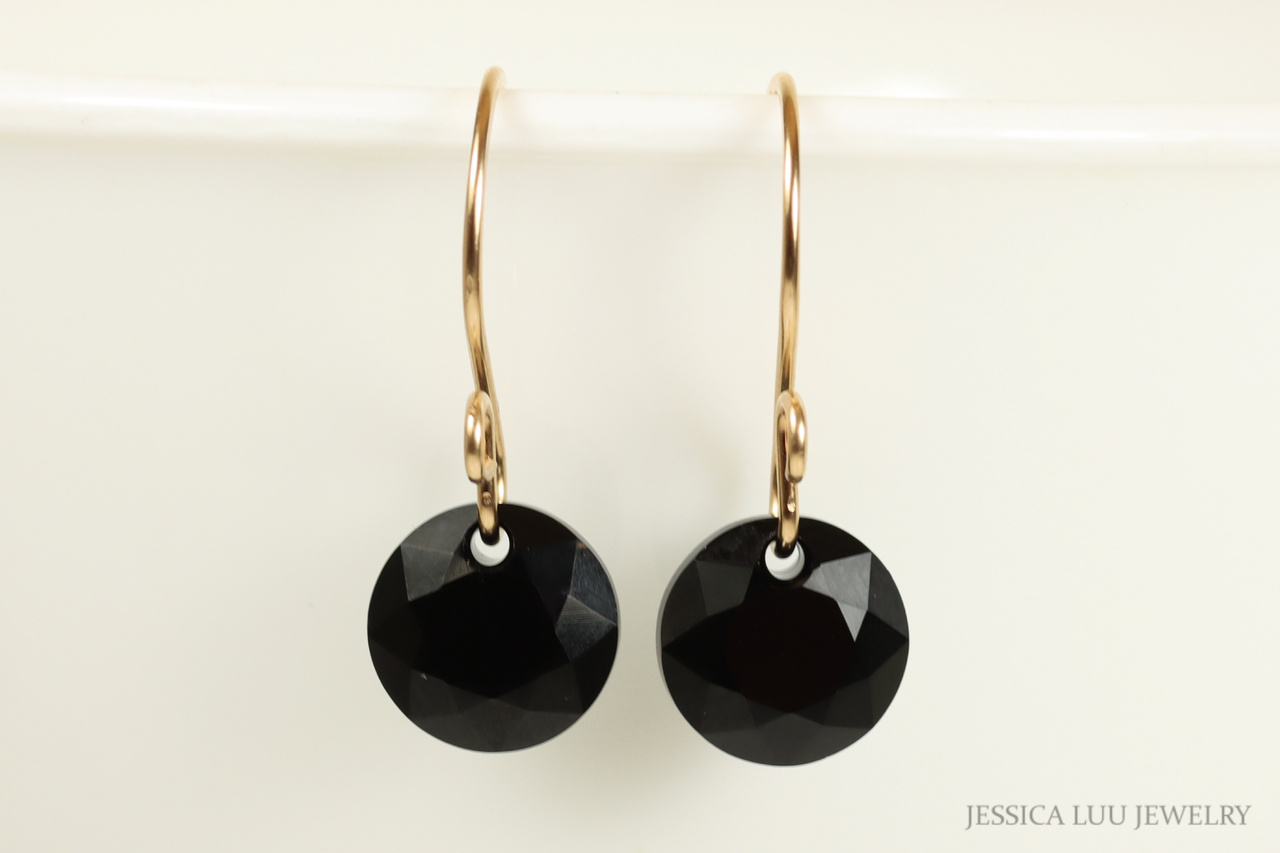 10mm faceted round jet black Austrian crystal dangle earrings, handcrafted by Jessica Luu Jewelry. Featuring 14K yellow or rose gold filled hook ear wires, these earrings exude elegance and sophistication. The faceted black onyx crystals catch the light beautifully, creating a mesmerizing sparkle with every movement. Measuring approximately 0.39 inches (10mm) in diameter, these earrings are the perfect size to make a statement without being overwhelming. Whether you're dressing up for a special occasion or adding a touch of glamour to your everyday look, these dangle earrings will elevate your ensemble. Handmade with meticulous attention to detail, these earrings are a testament to Jessica Luu Jewelry's commitment to quality and craftsmanship.