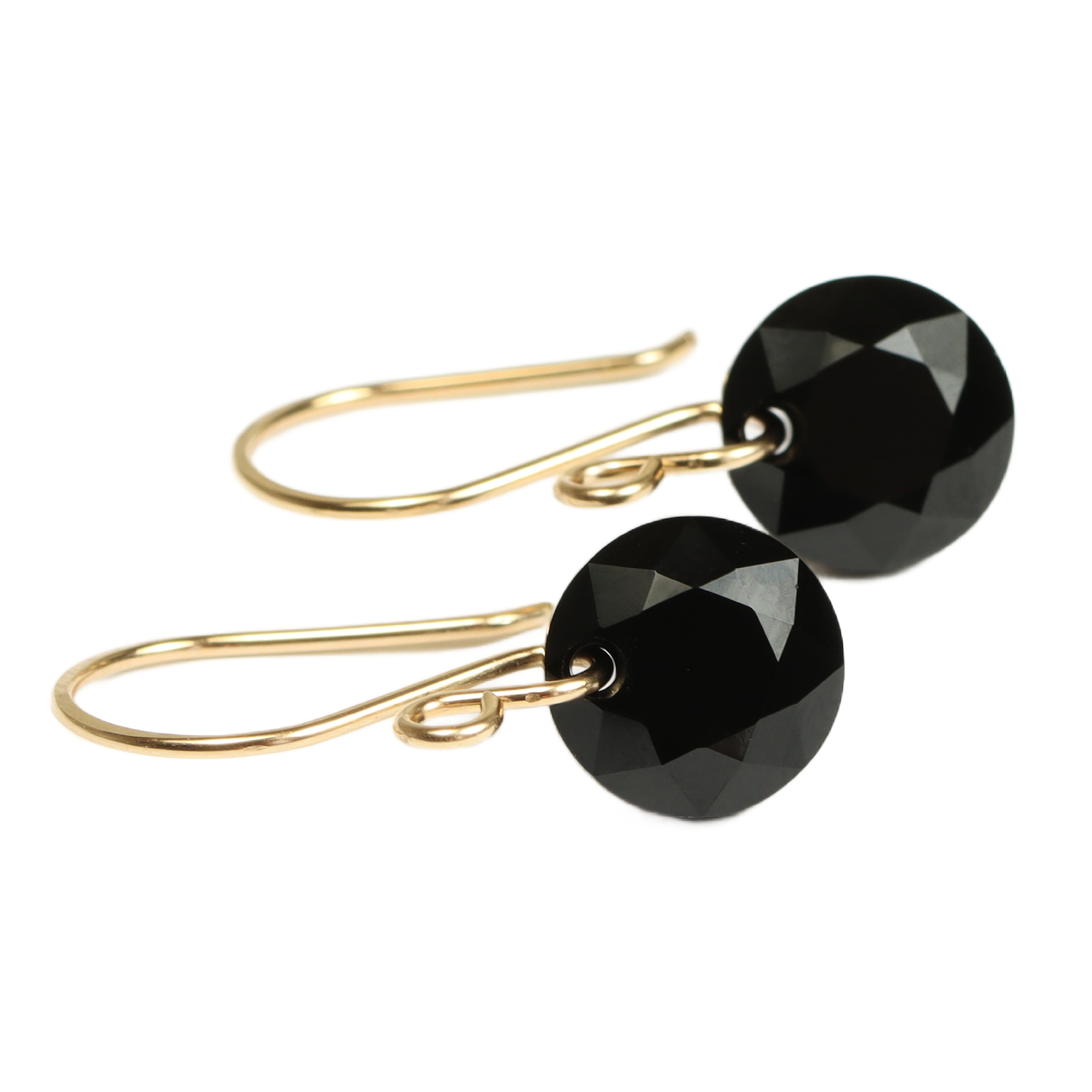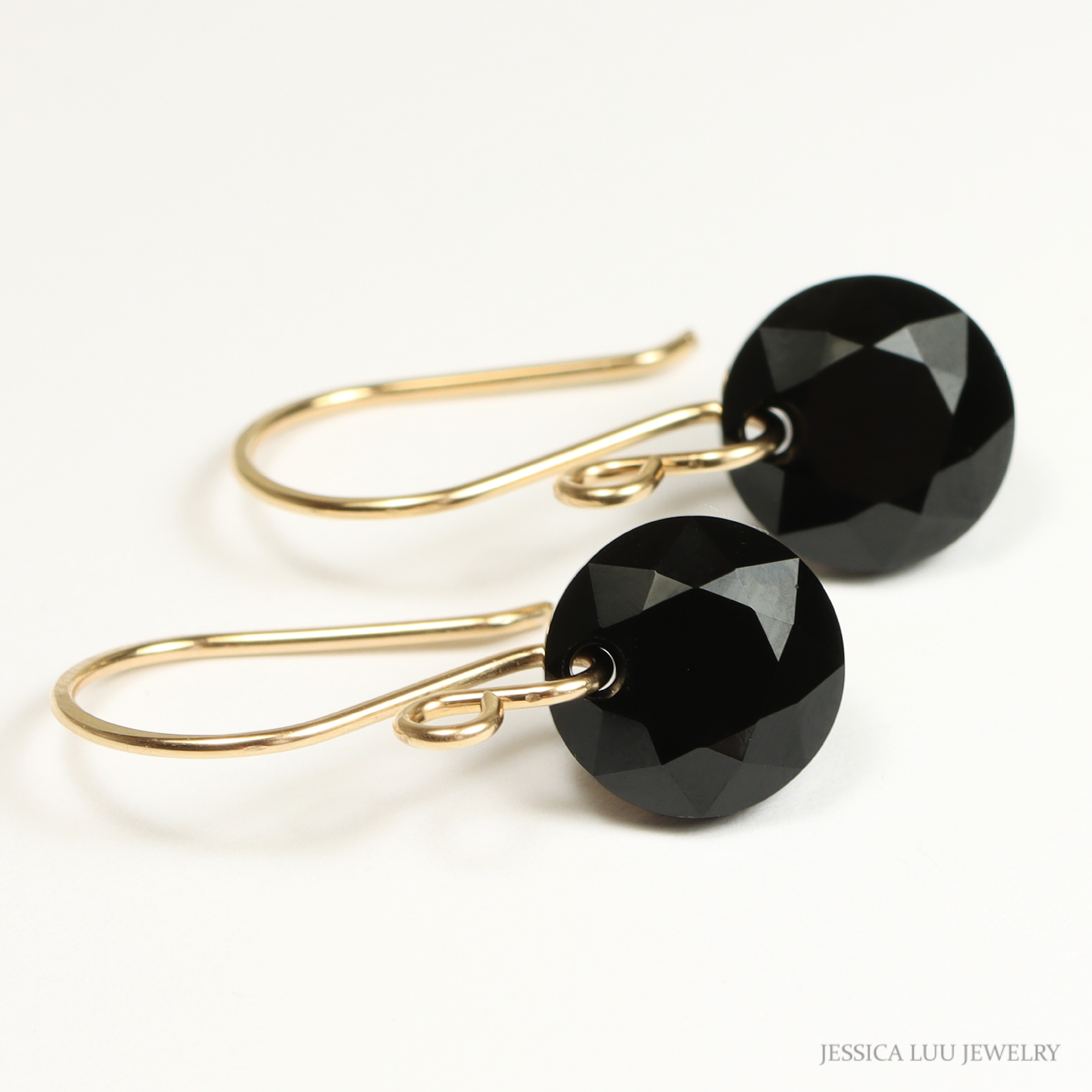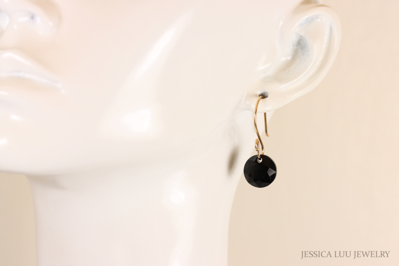 10mm faceted round jet black Austrian crystal dangle earrings, handcrafted by Jessica Luu Jewelry. Featuring 14K yellow or rose gold filled hook ear wires, these earrings exude elegance and sophistication. The faceted black onyx crystals catch the light beautifully, creating a mesmerizing sparkle with every movement. Measuring approximately 0.39 inches (10mm) in diameter, these earrings are the perfect size to make a statement without being overwhelming. Whether you're dressing up for a special occasion or adding a touch of glamour to your everyday look, these dangle earrings will elevate your ensemble. Handmade with meticulous attention to detail, these earrings are a testament to Jessica Luu Jewelry's commitment to quality and craftsmanship.