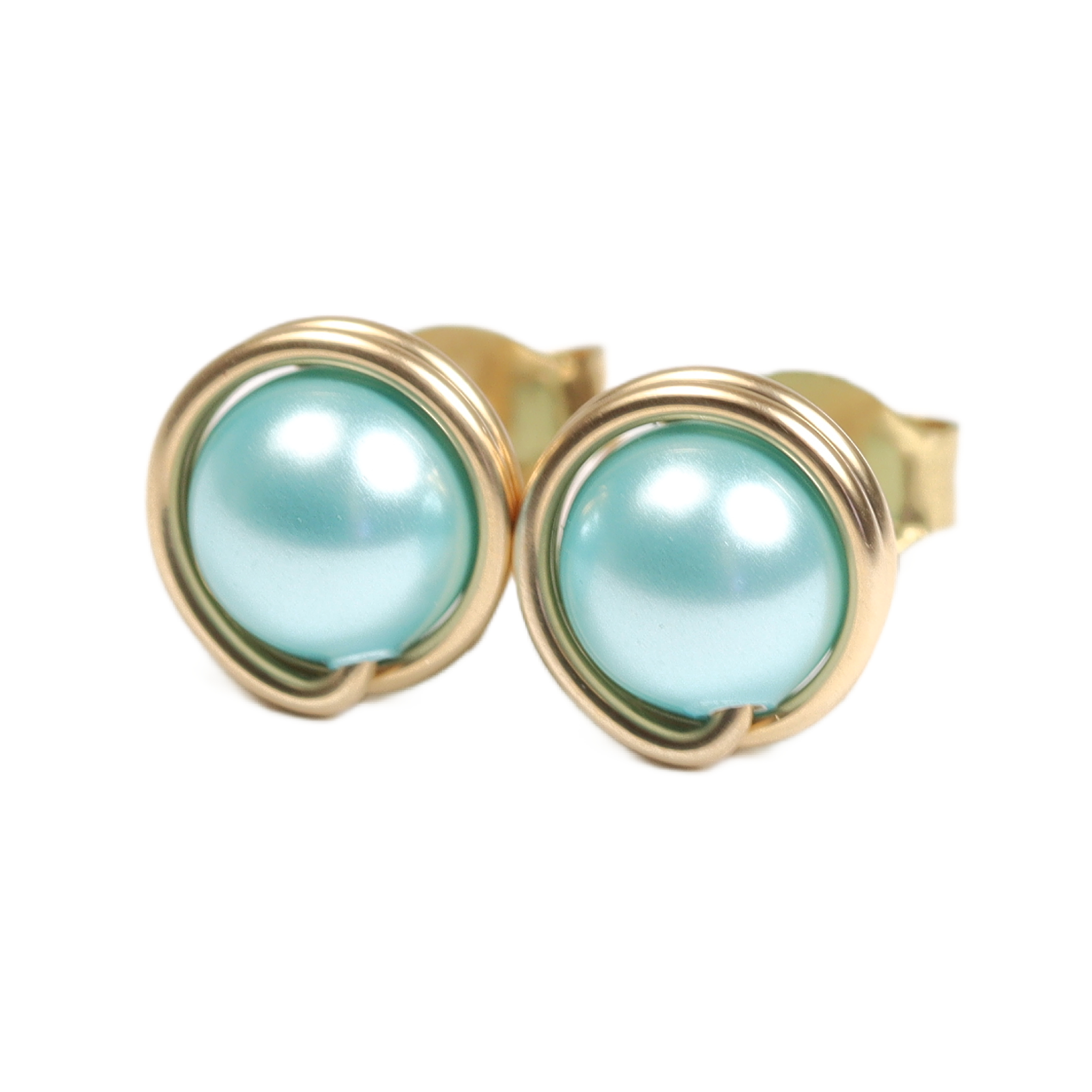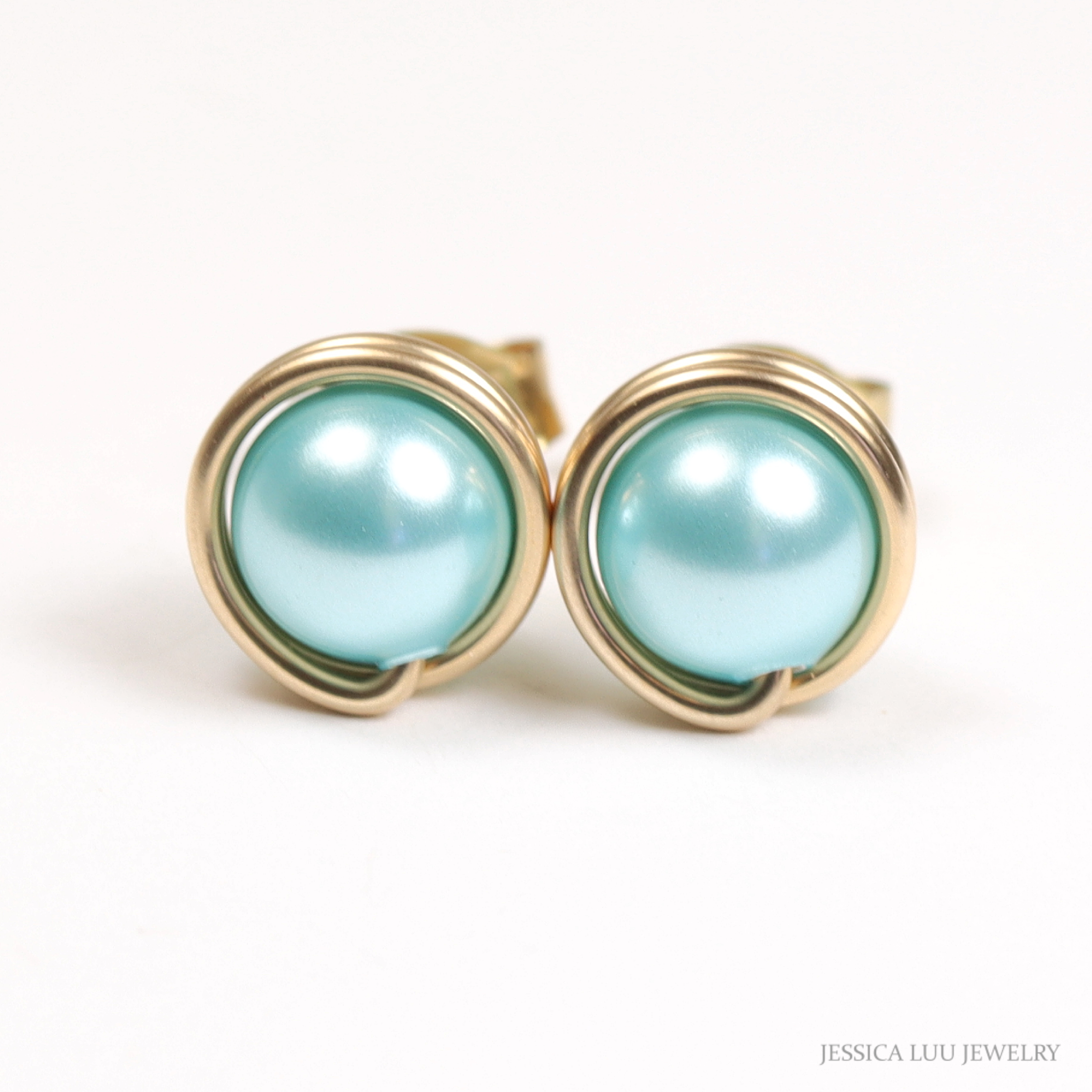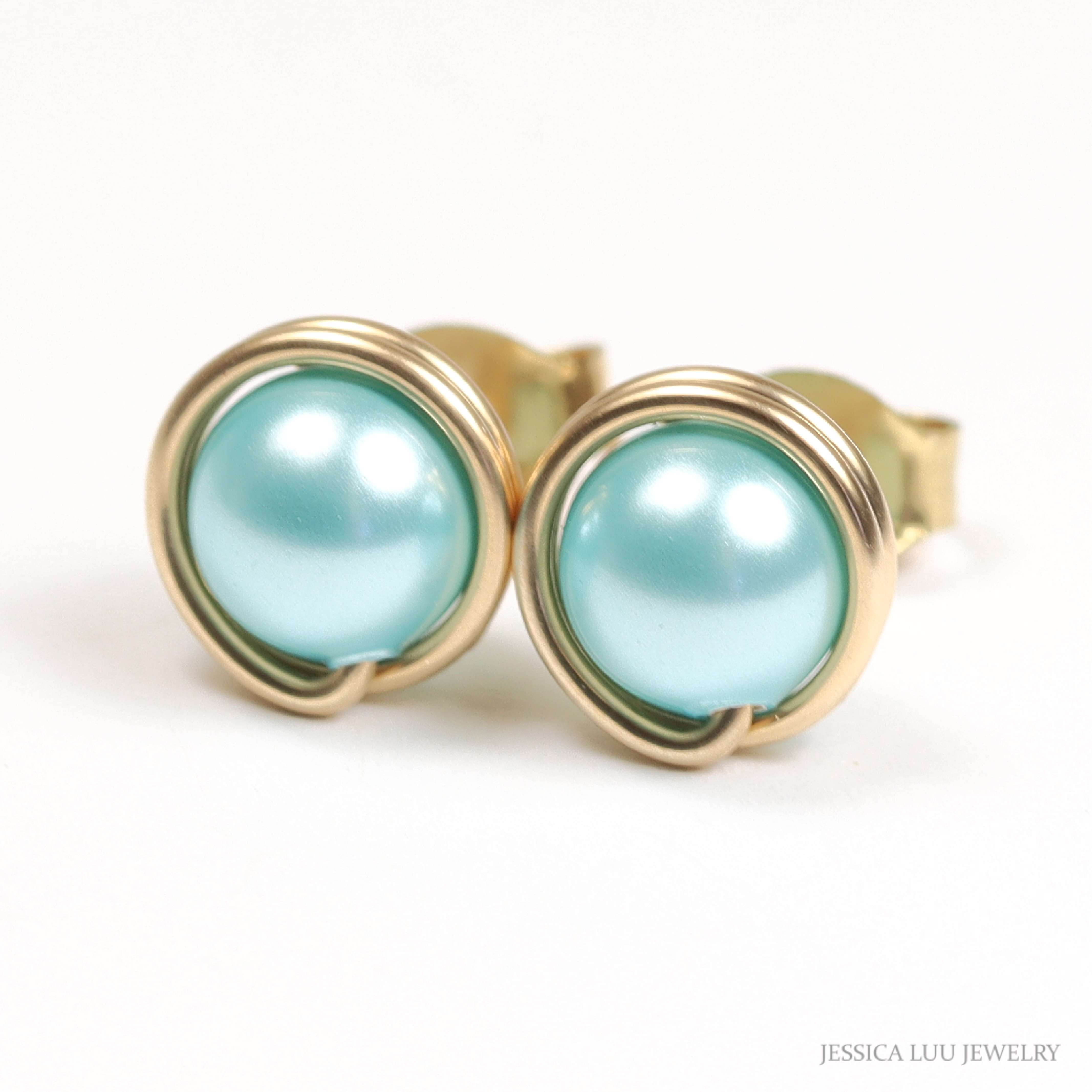 Gold Aqua Blue Pearl Stud Earrings Handmade by Jessica Luu Jewelry