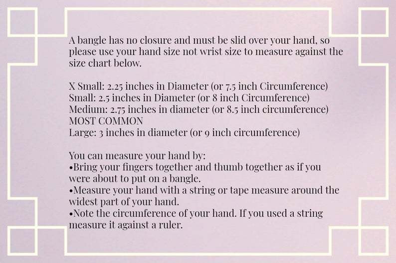 ~ FIT NOTE: This bangle slides over the hand and does not open, so please choose your hand size and not wrist size.