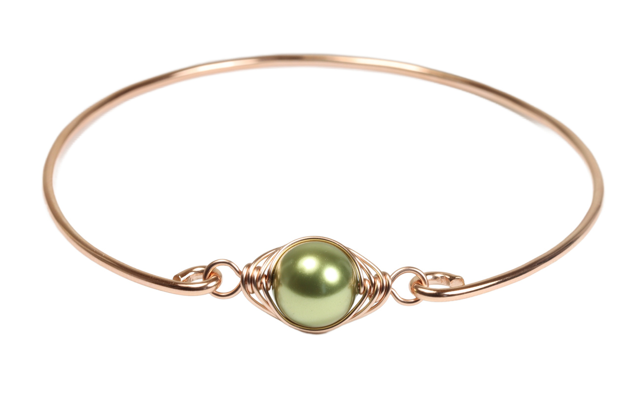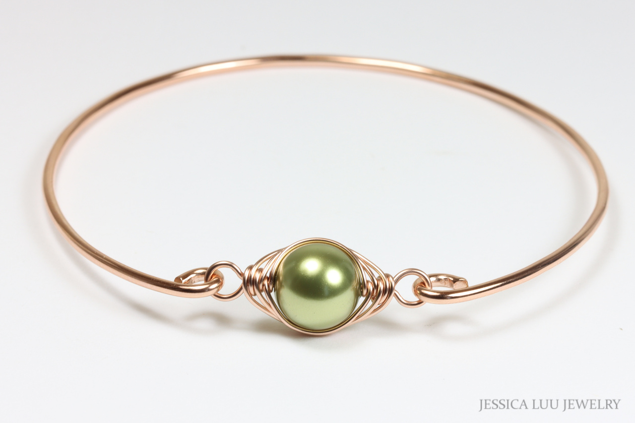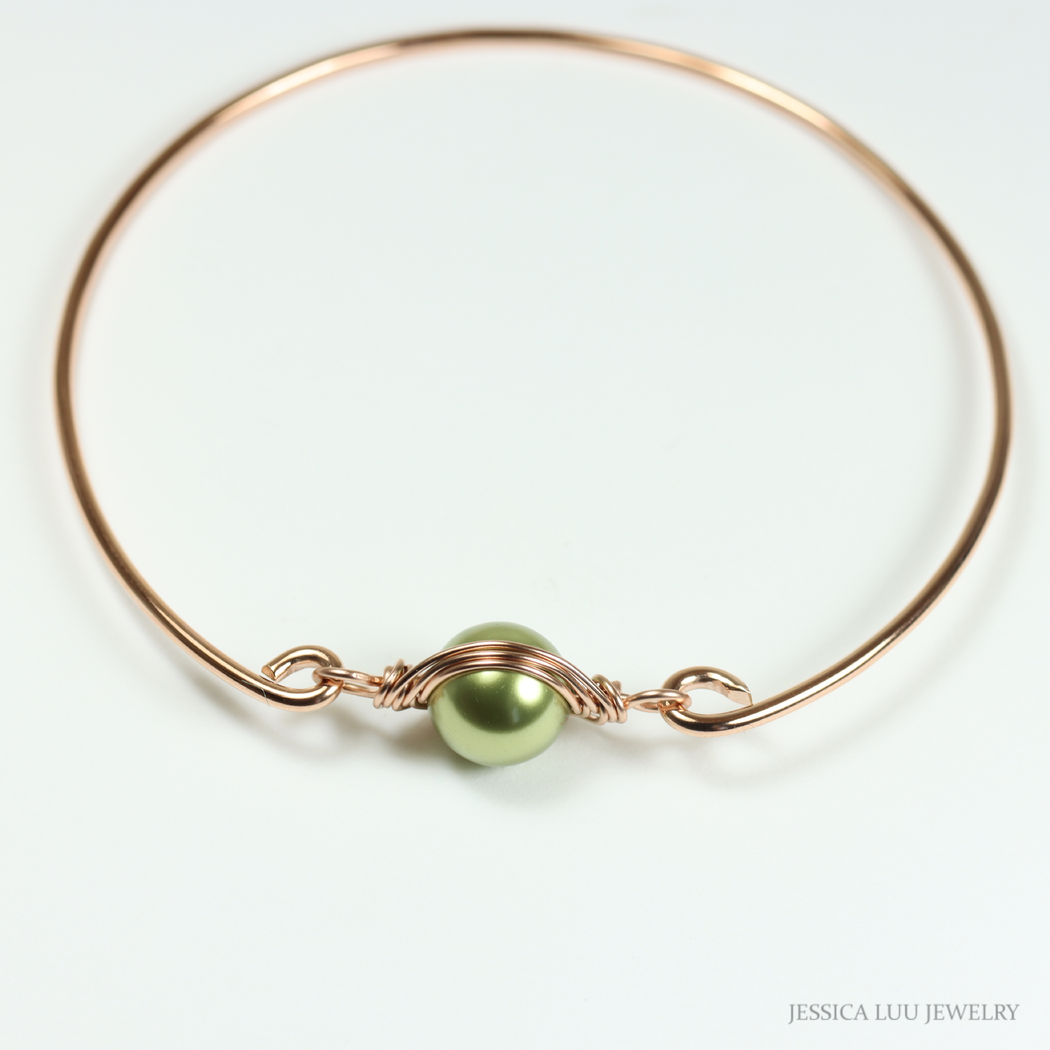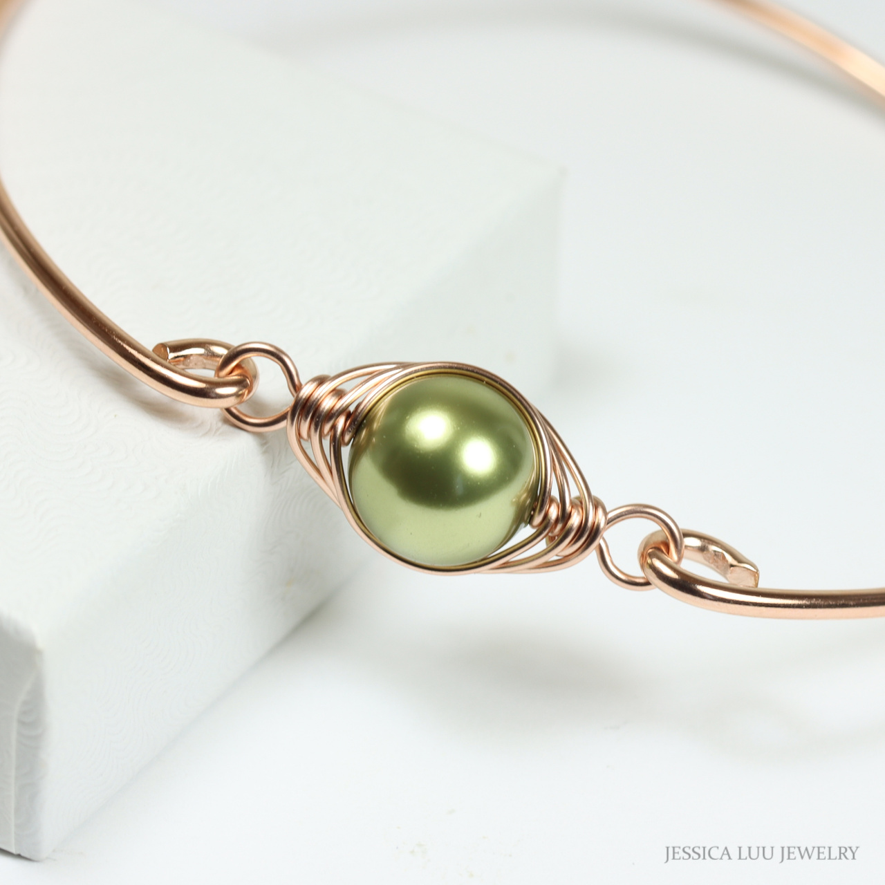 Rose Gold Olive Green Pearl Bangle Bracelet Handmade by Jessica Luu Jewelry