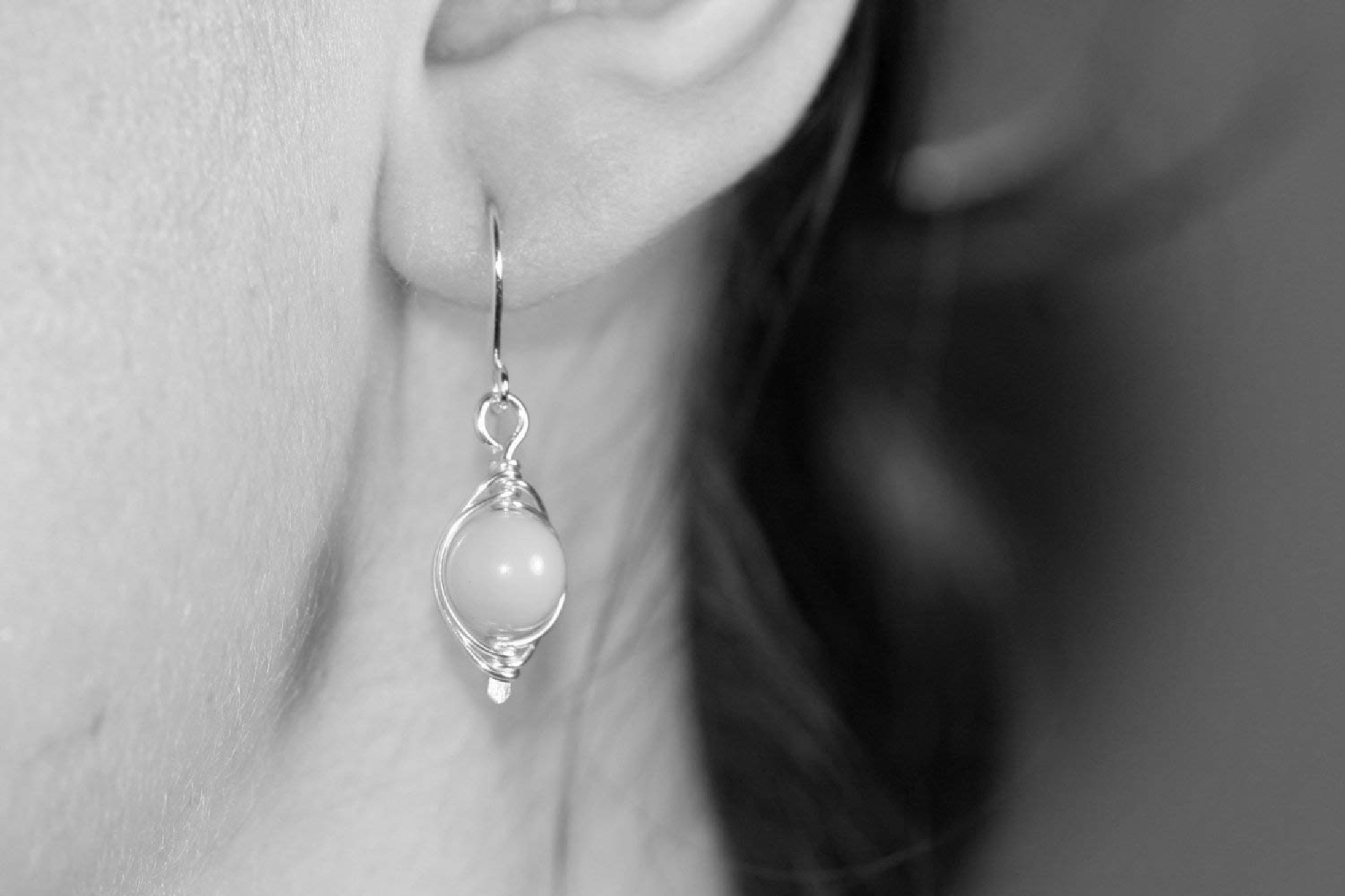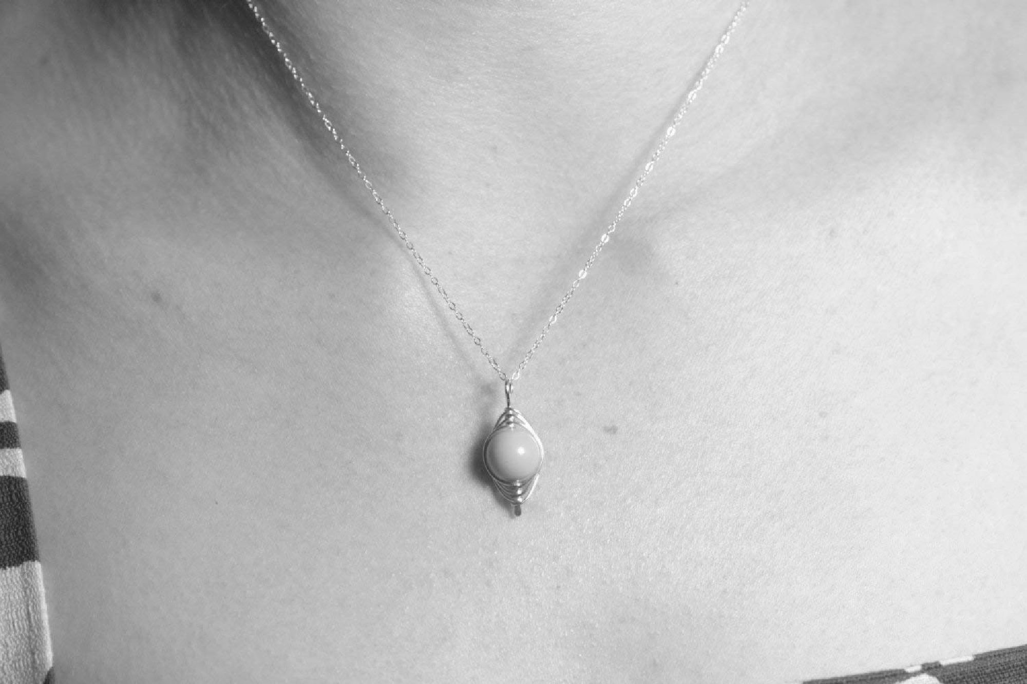 HOW IT’S MADE: A large round nacre pearl is wire wrapped by hand herringbone style with sterling silver or 14K gold filled and hung from a delicate chain. Gold filled wire is a hollow tube of 14 karat gold that is filled with brass for durability, so all the metal outside is 14K gold; gold filled wire will not wear off like gold plating and will last a lifetime.