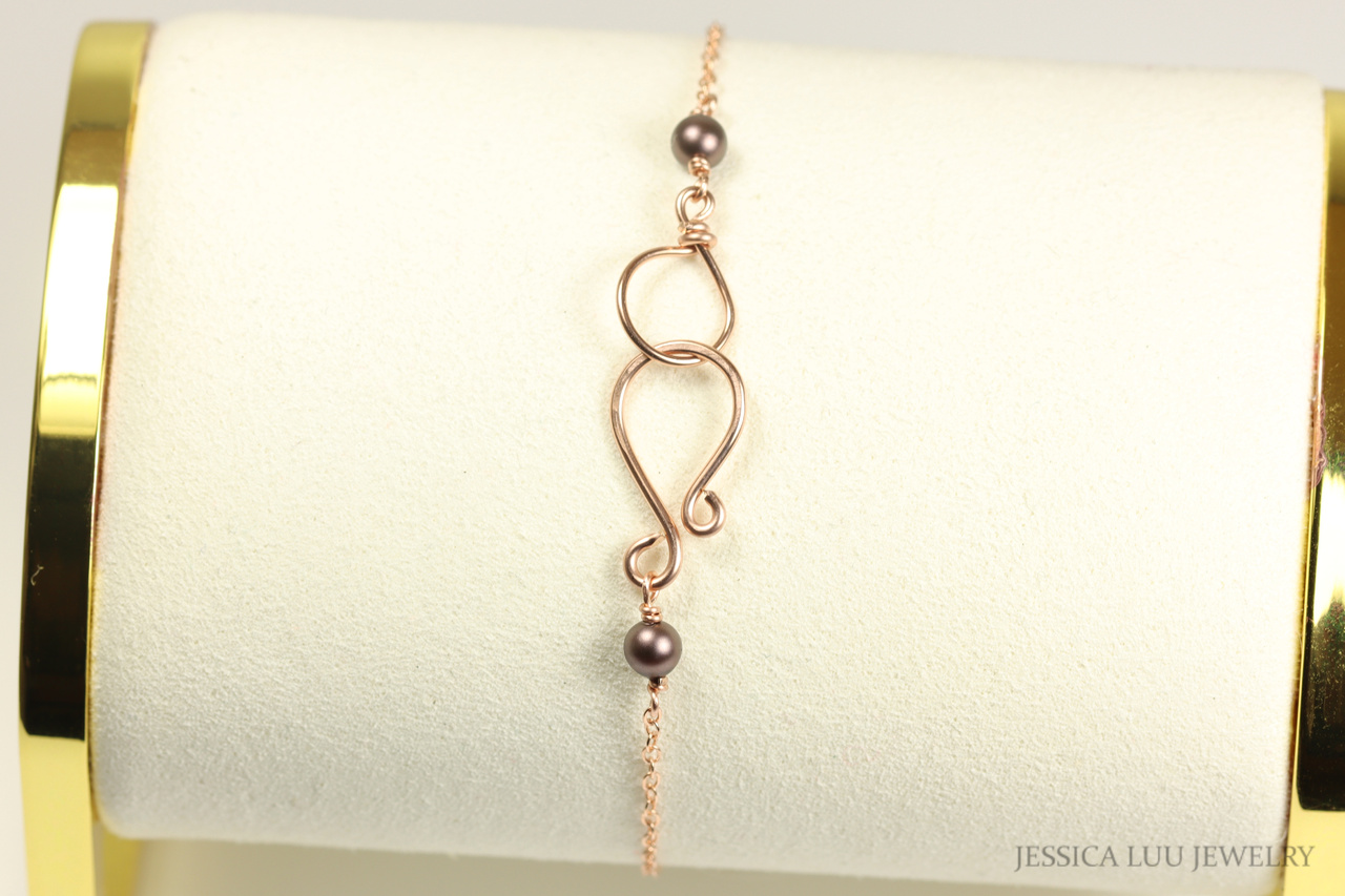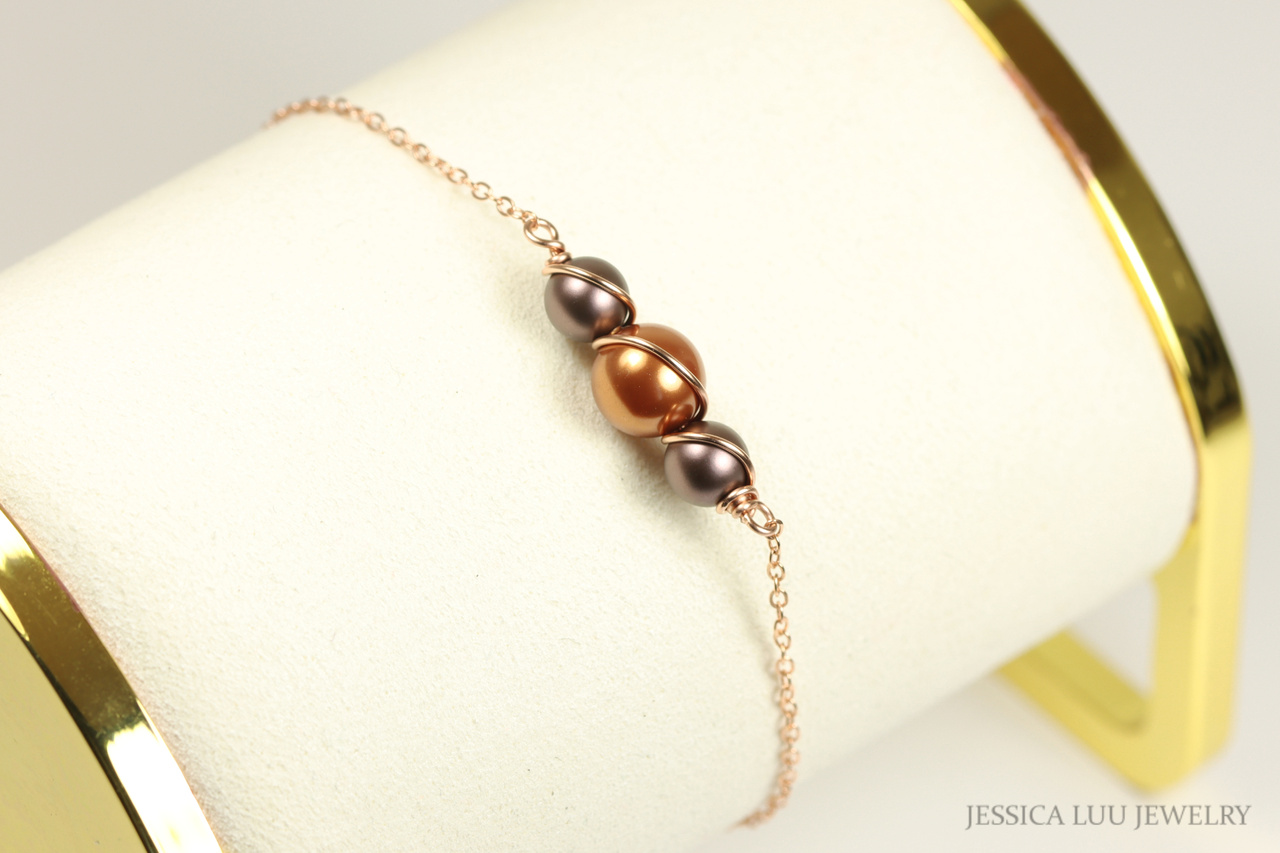 Chocolate brown and copper colored pearls in 14K rose gold filled chain bracelet with hook and eye clasp handmade by Jessica Luu Jewelry. Crafted with meticulous attention to detail, it features a delicate 14K rose gold filled chain adorned with exquisite chocolate brown and copper-hued pearls. The unique combination of colors creates a captivating contrast that effortlessly complements any ensemble. Designed for both casual and formal occasions, this bracelet boasts a hook and eye clasp for a secure and comfortable fit. With its exceptional craftsmanship and stunning aesthetic, this piece is a true testament to Jessica Luu's artistry and commitment to creating wearable works of art.