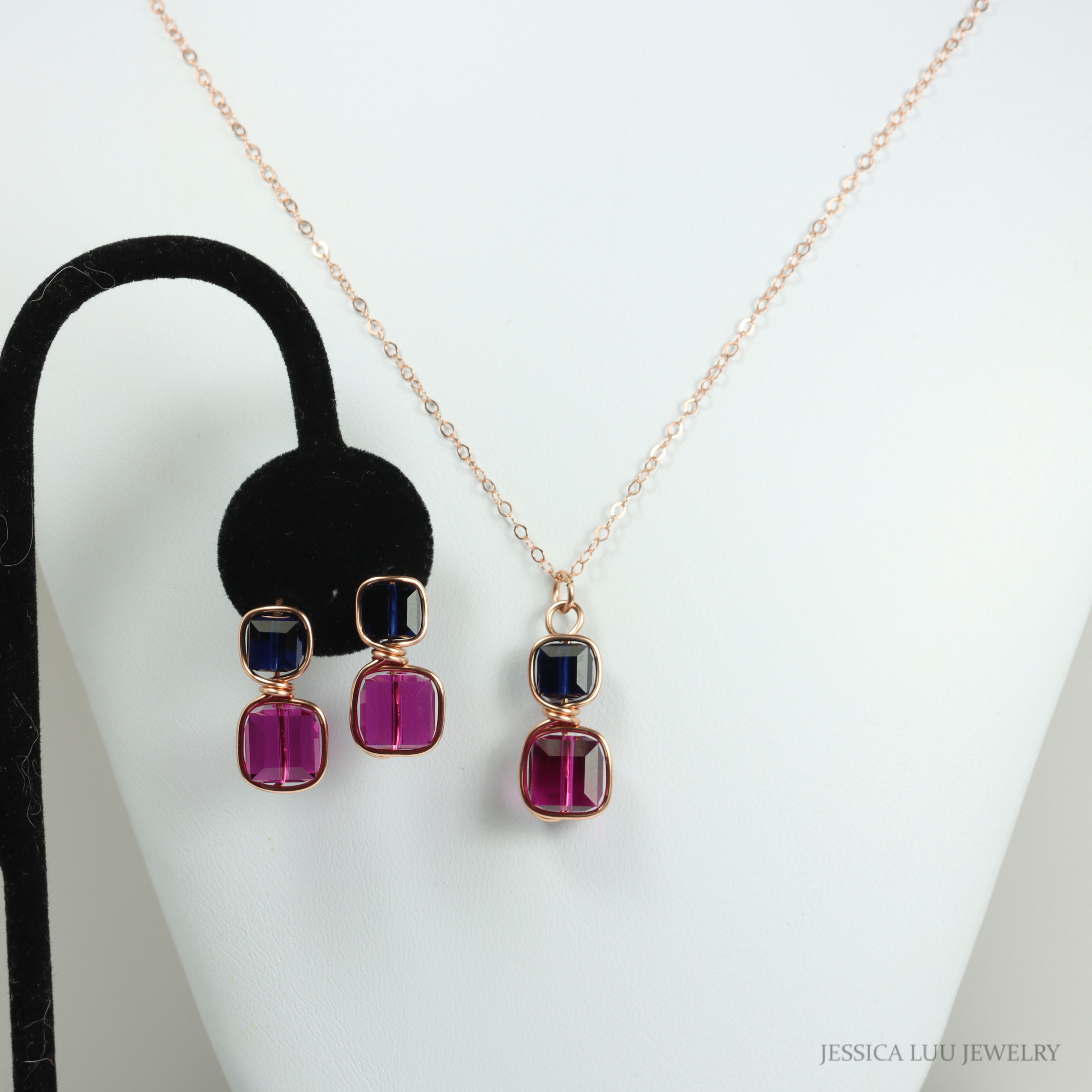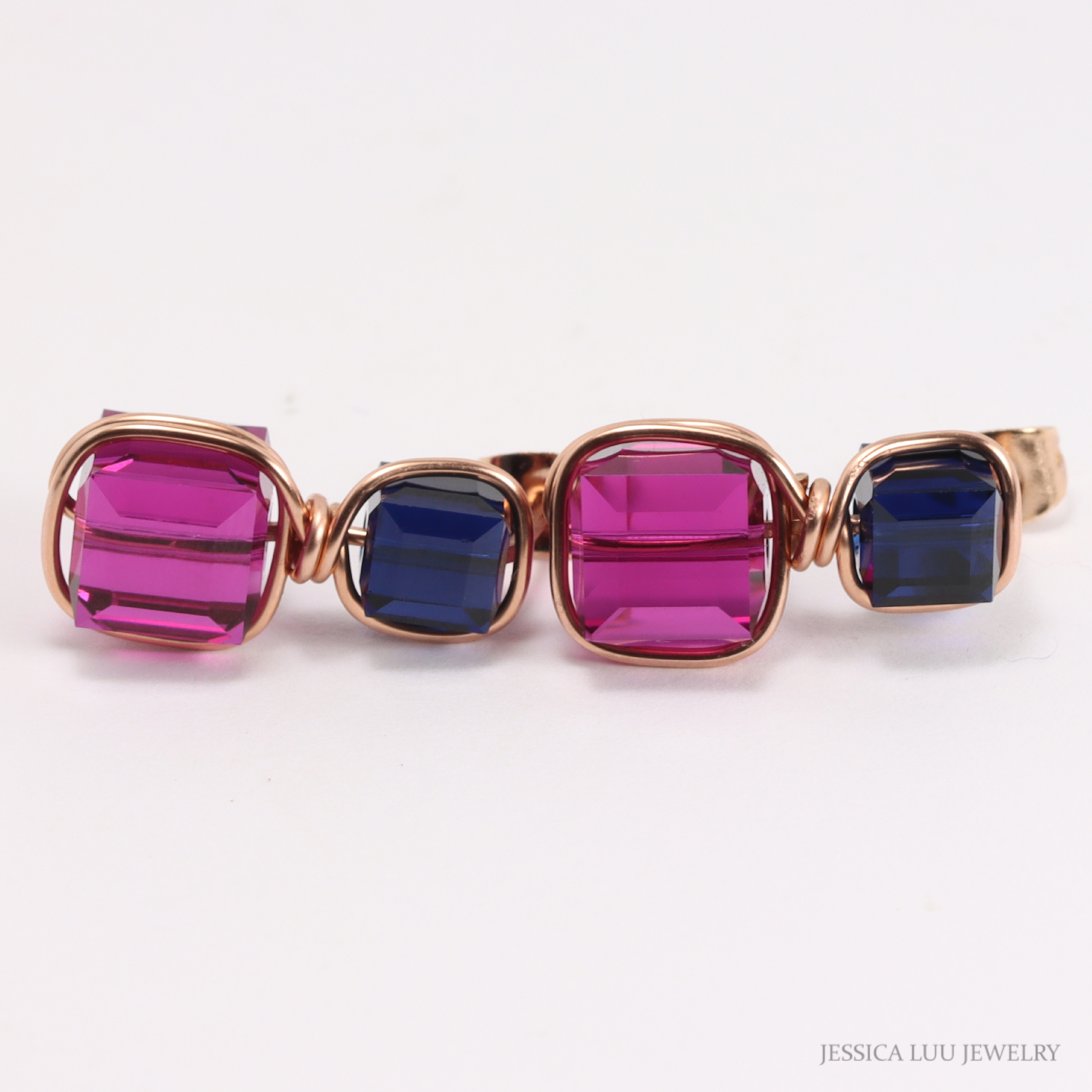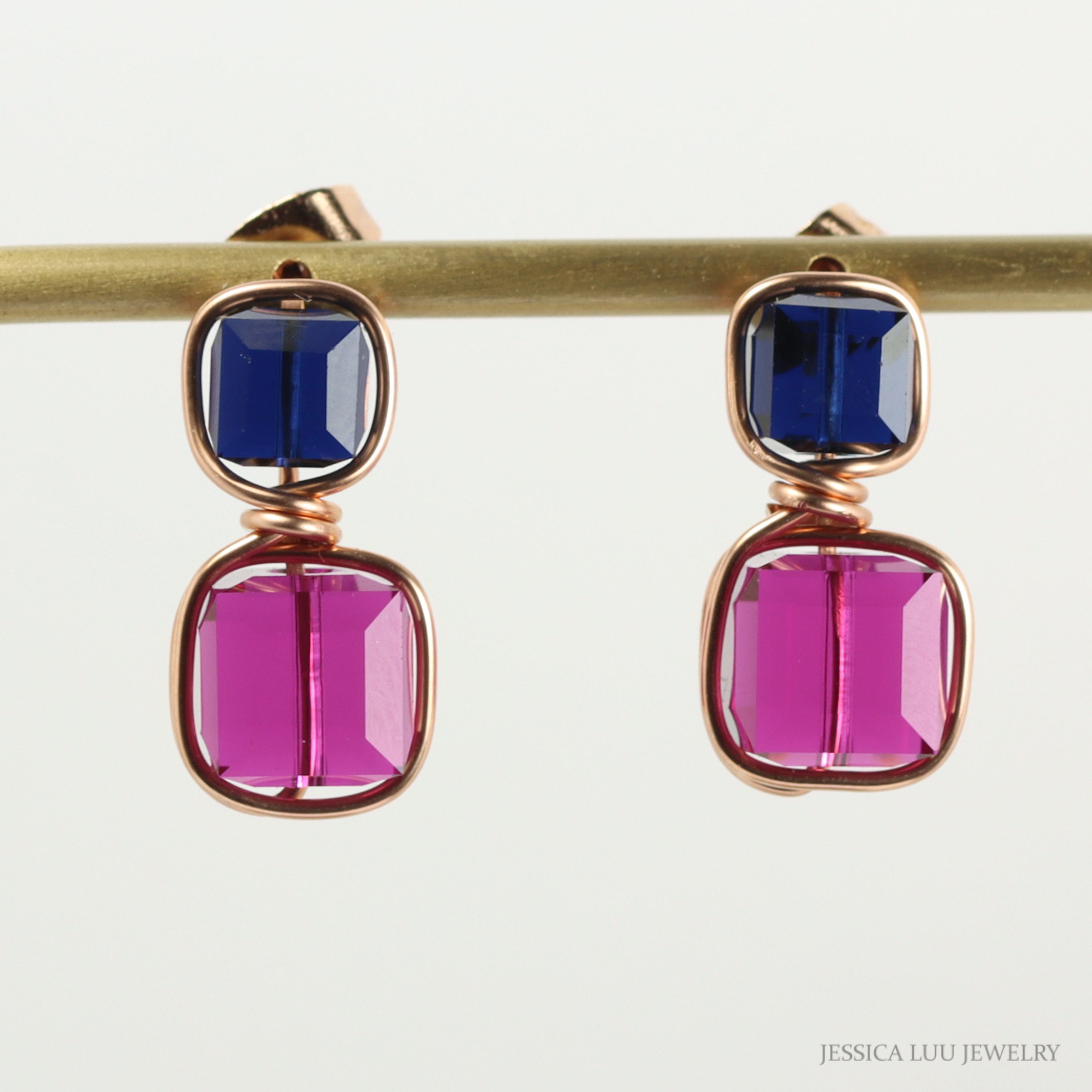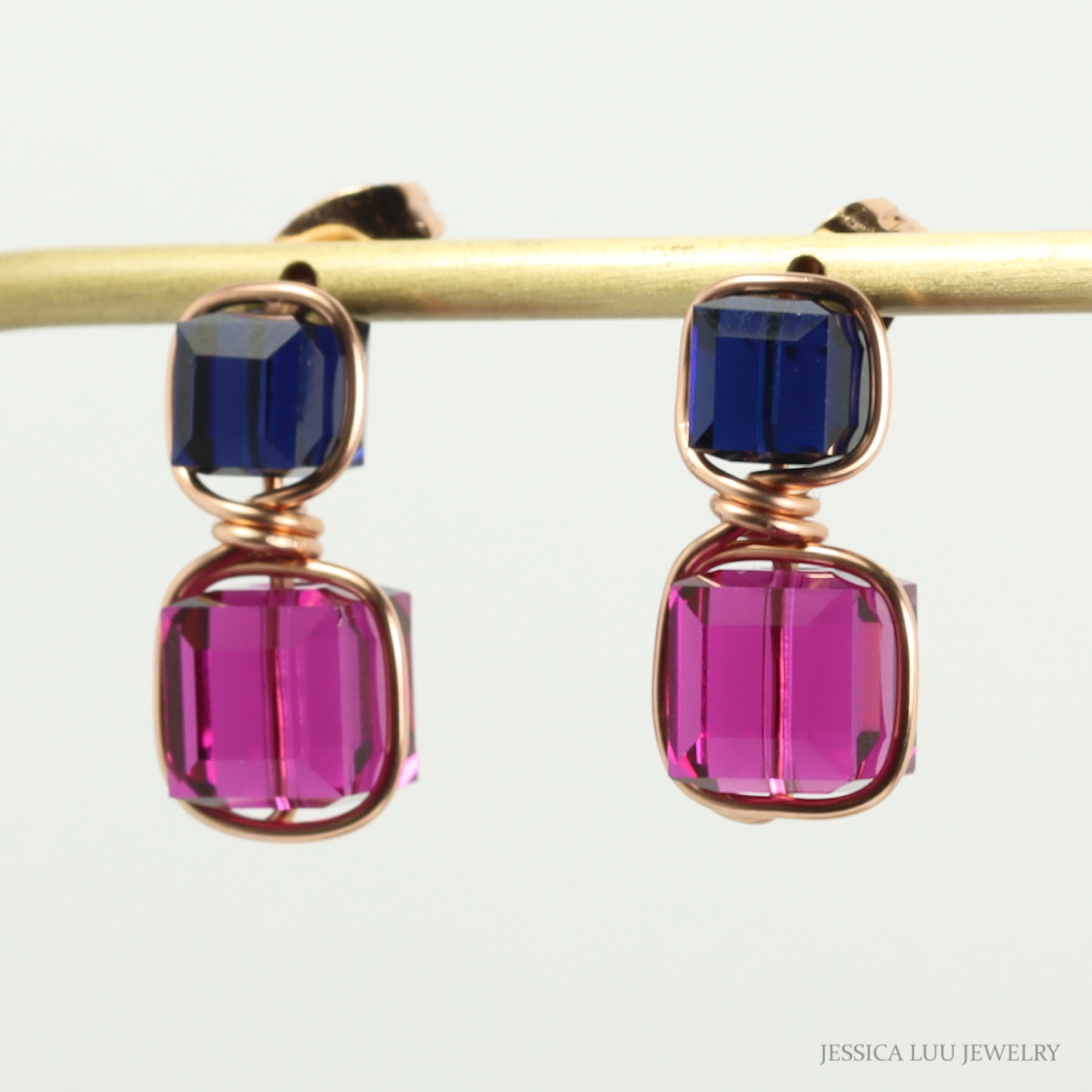 14K rose gold filled wire wrapped earrings from Jessica Luu Jewelry. Featuring stunning 6mm navy blue faceted cube Austrian crystal posts and 8mm fuchsia pink purple faceted cube Austrian crystal drops, these handmade earrings are a true work of art. The wire wrapping technique adds a touch of elegance and sophistication, while the vibrant colors of the crystals will make you stand out in any crowd. Perfect for special occasions or everyday wear, these earrings are sure to become a cherished addition to your jewelry collection. Measuring approximately .75 inches in length, they strike the perfect balance between statement-making and understated elegance. Treat yourself or someone special to these one-of-a-kind earrings and experience the beauty of handcrafted jewelry.
