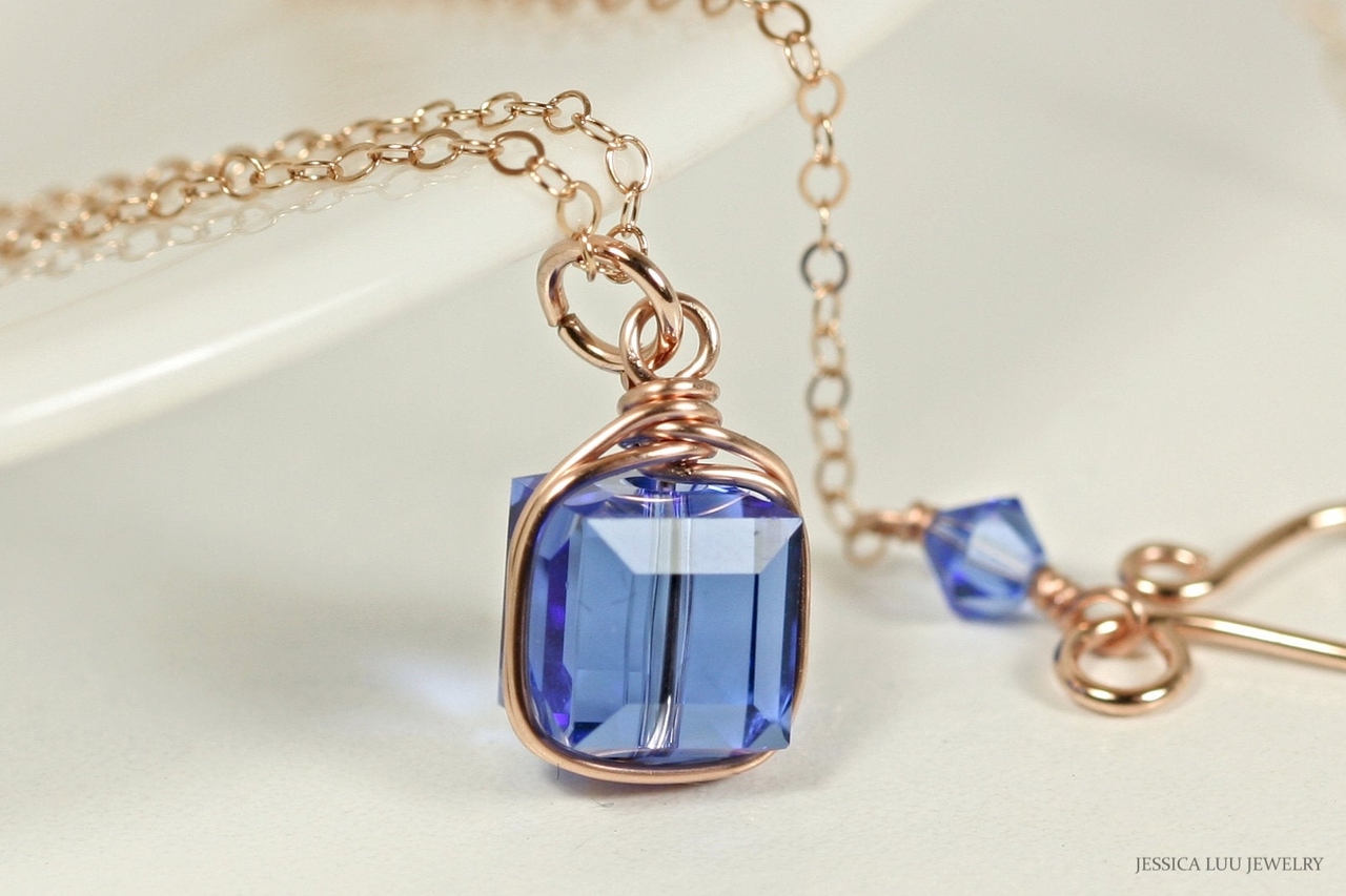 Versatile and perfect for everyday wear, these square crystal stud earrings are available in 14K rose gold and yellow gold with matching necklace. Sapphire is September's birthstone making these earrings the perfect gift for that special someone (including you).