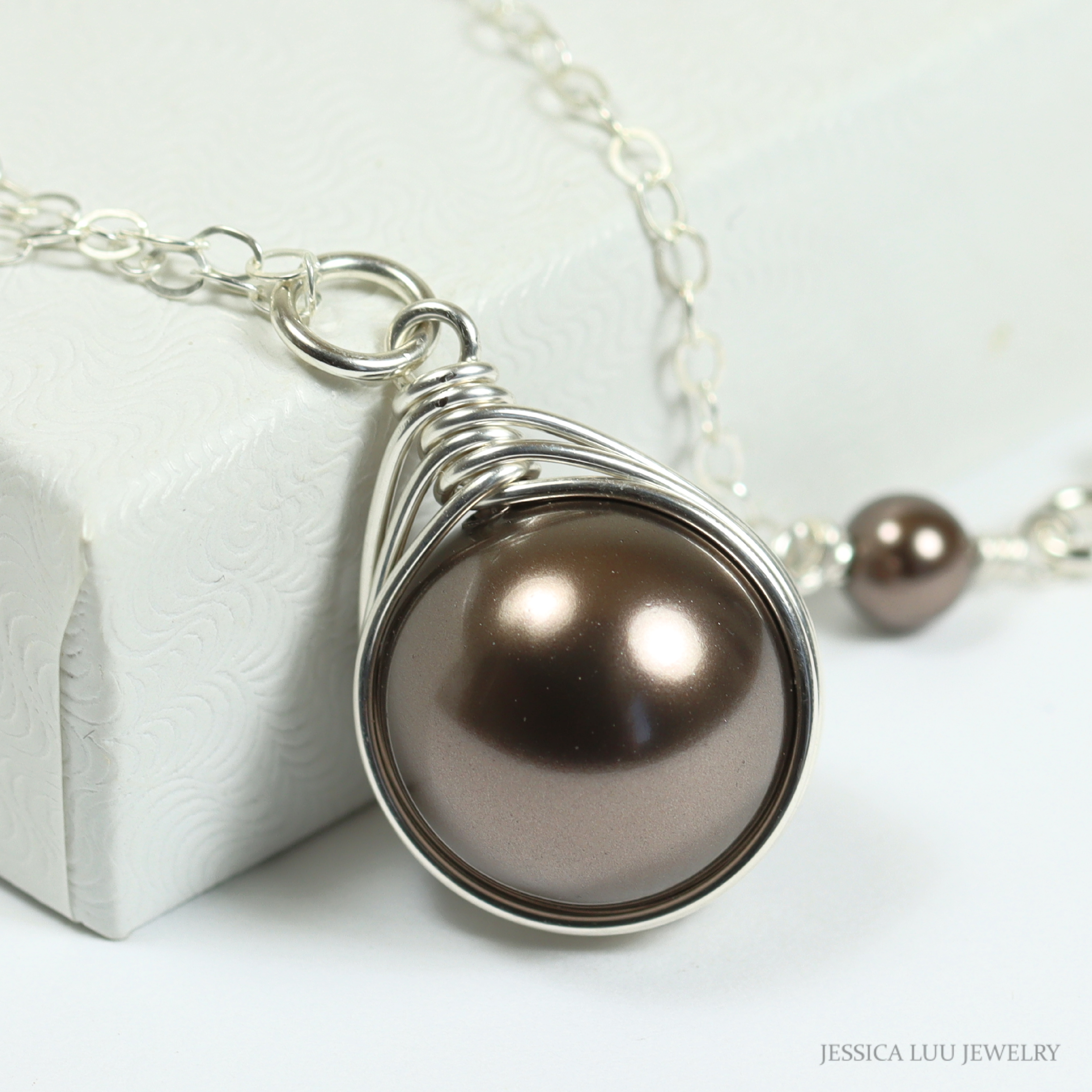 These beautiful dark chocolate brown crystal nacre pearl drop earrings are handmade by Jessica Luu Jewelry. The earrings feature 8mm dark chocolate brown crystal nacre pearls that are wire wrapped with sterling silver wire. The wire wrapping creates a delicate and elegant look that is perfect for any occasion. These earrings would make a lovely gift for a loved one or a special treat for yourself.