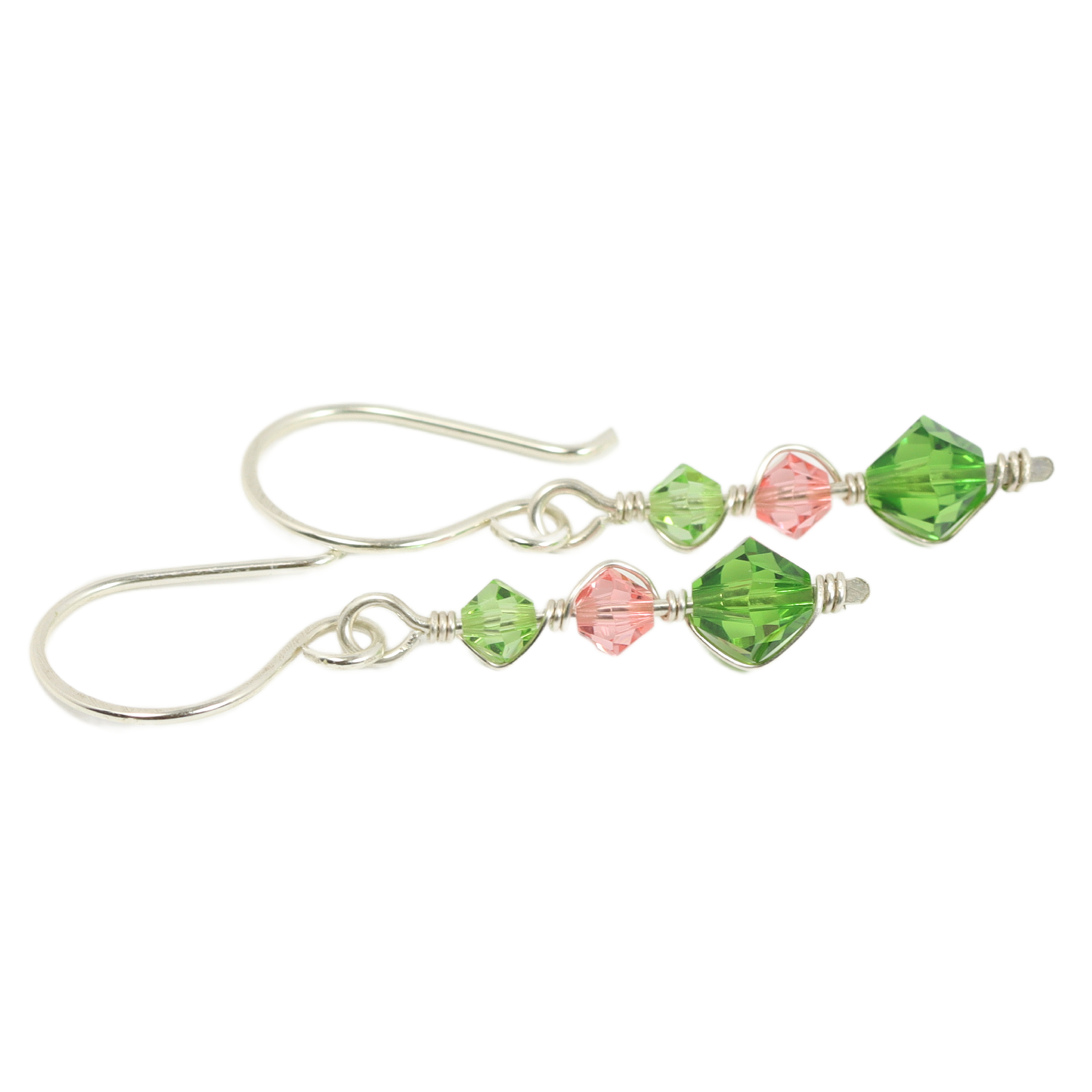 Wire Wrapped Peridot, Rose Peach and Fern Green Crystal Earrings Handmade by Jessica Luu Jewelry