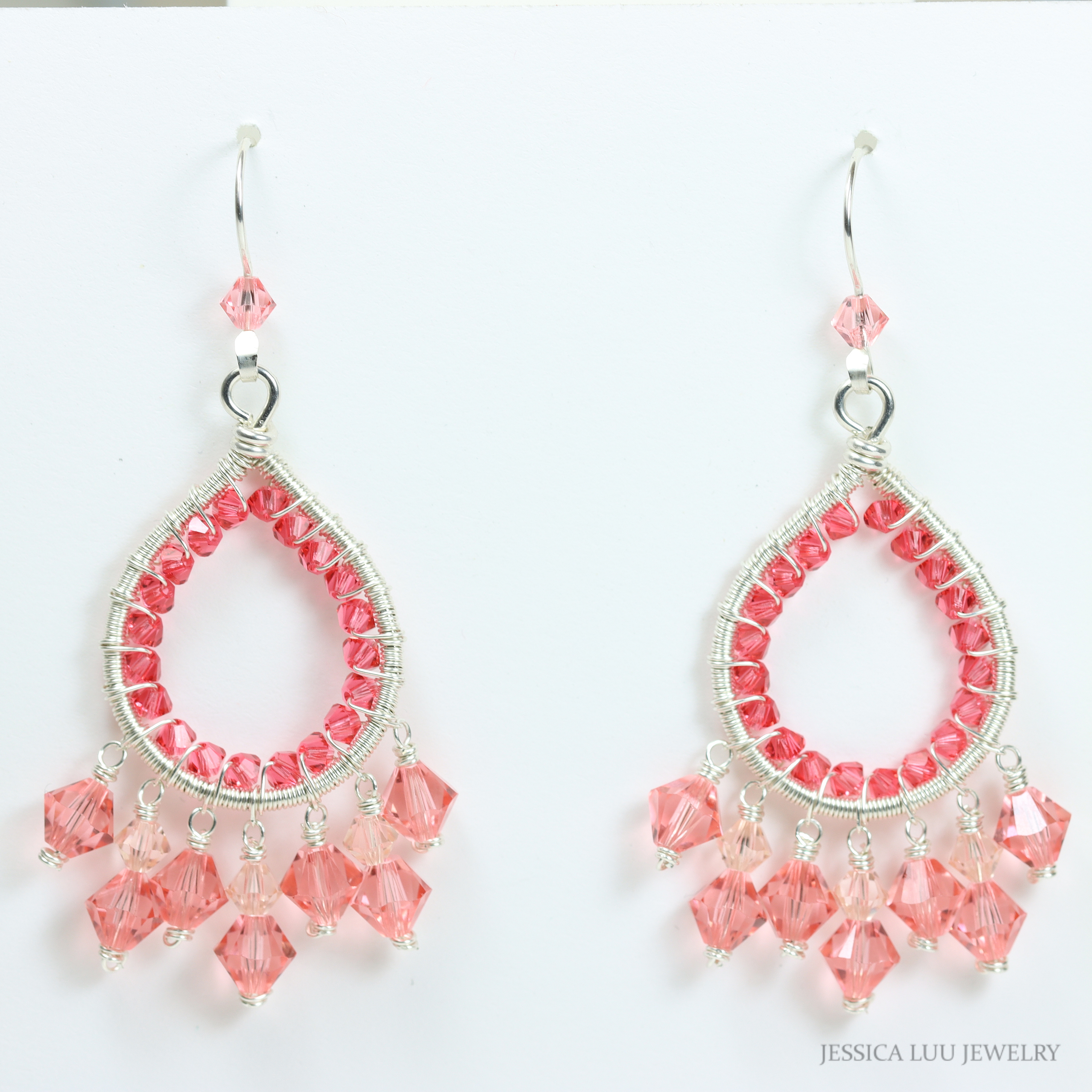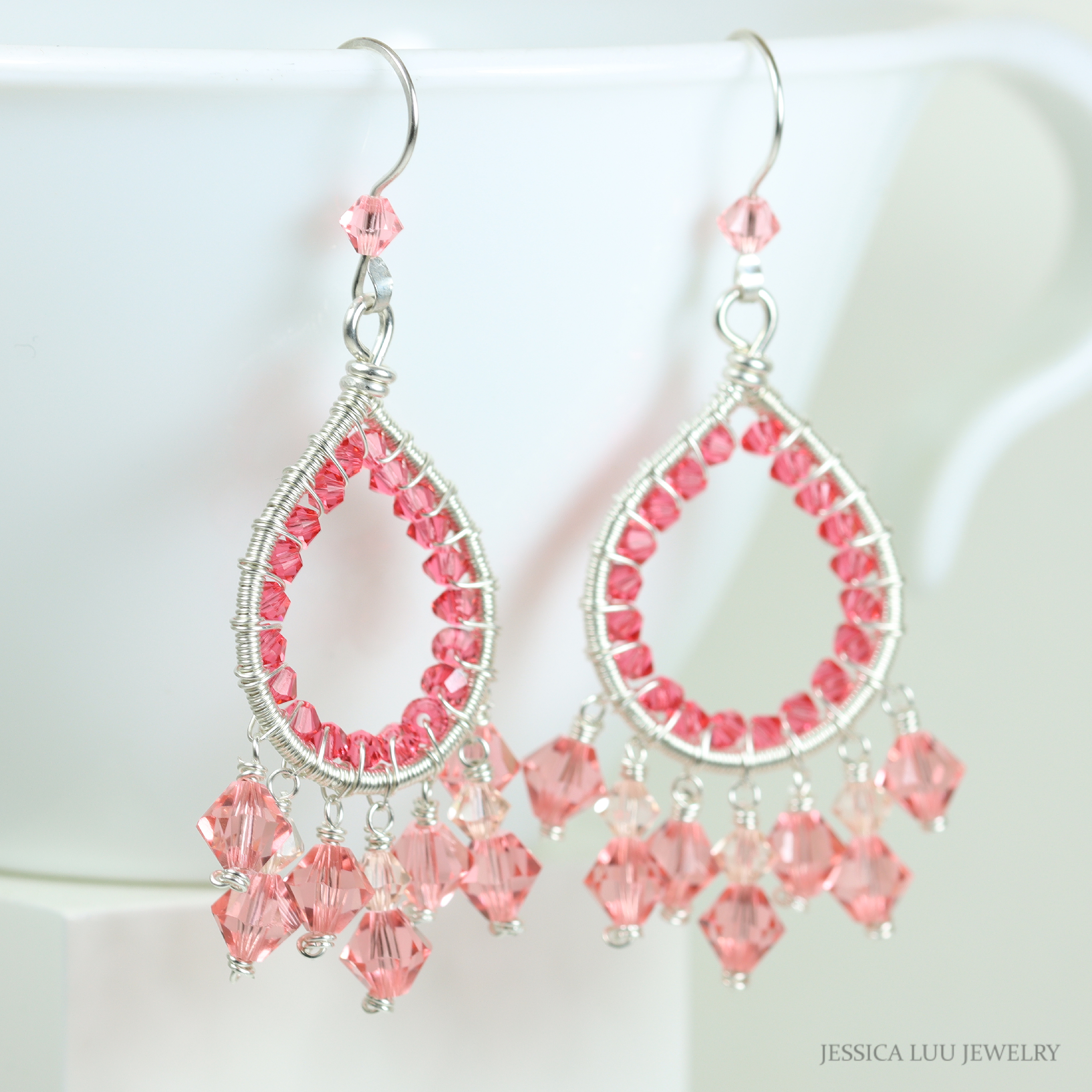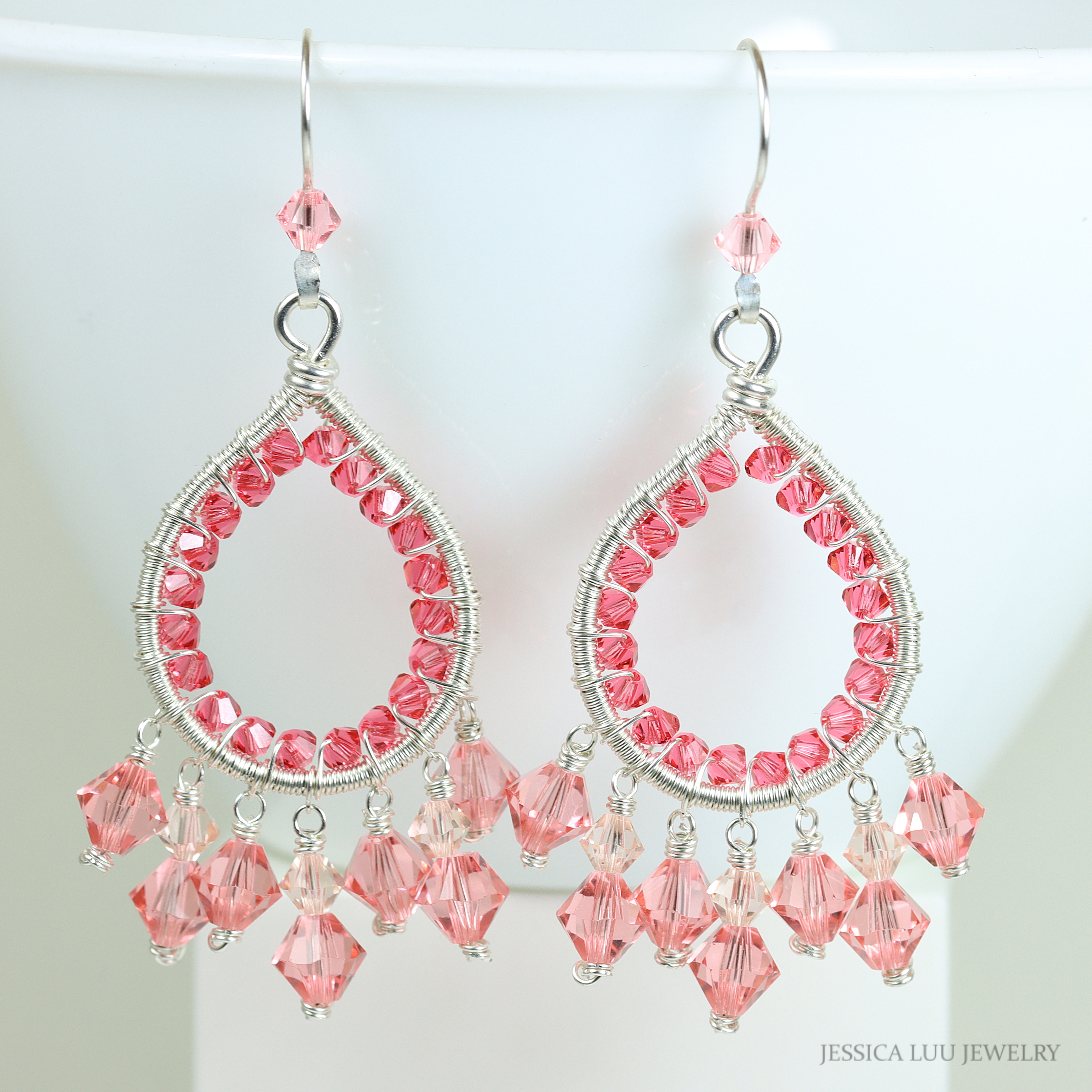 ~ HANDCRAFTED DESIGN: Elegant teardrop-shaped chandelier earrings featuring intricate wire-wrapped sterling silver and sparkling peach pink Austrian crystals