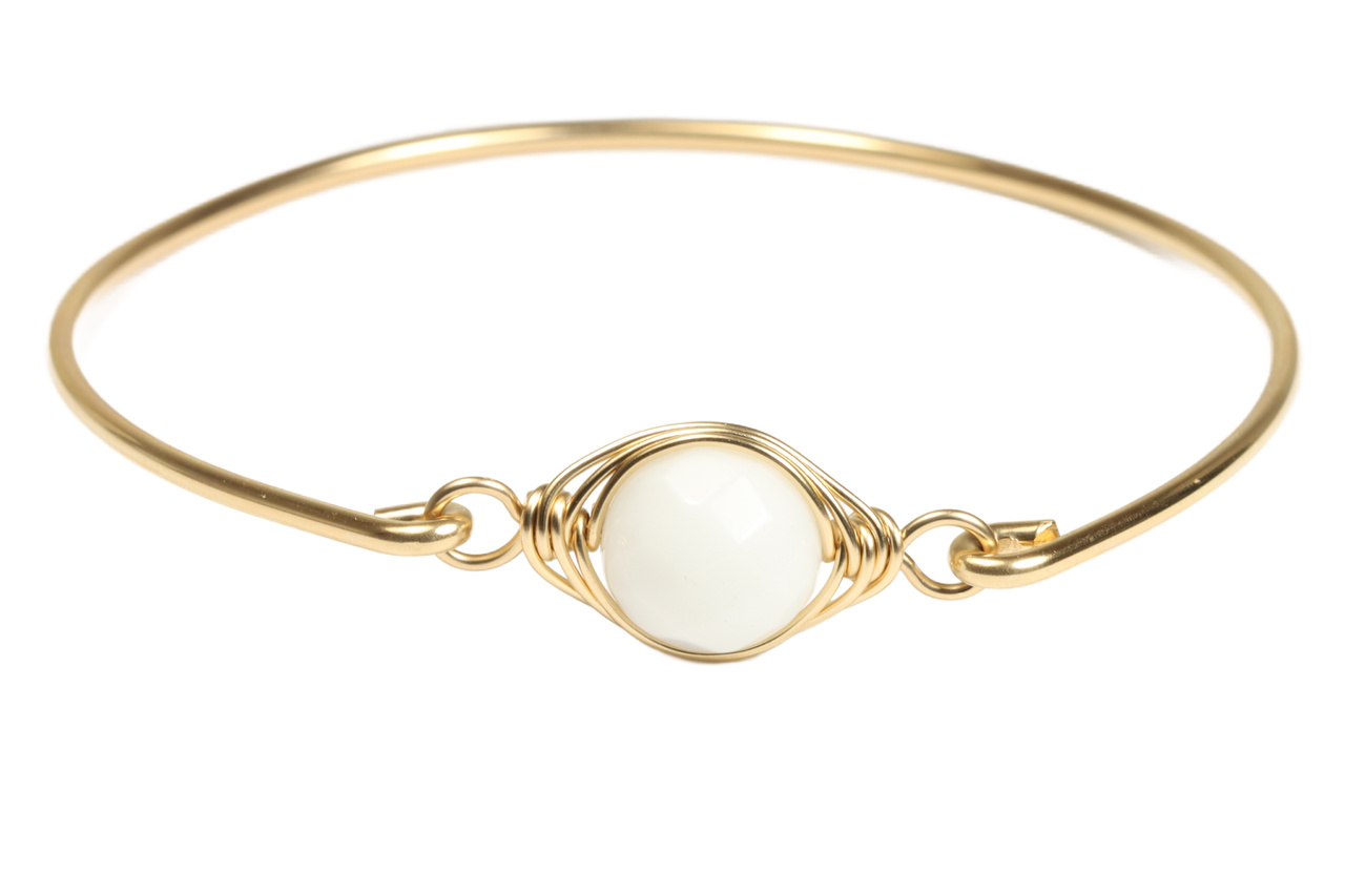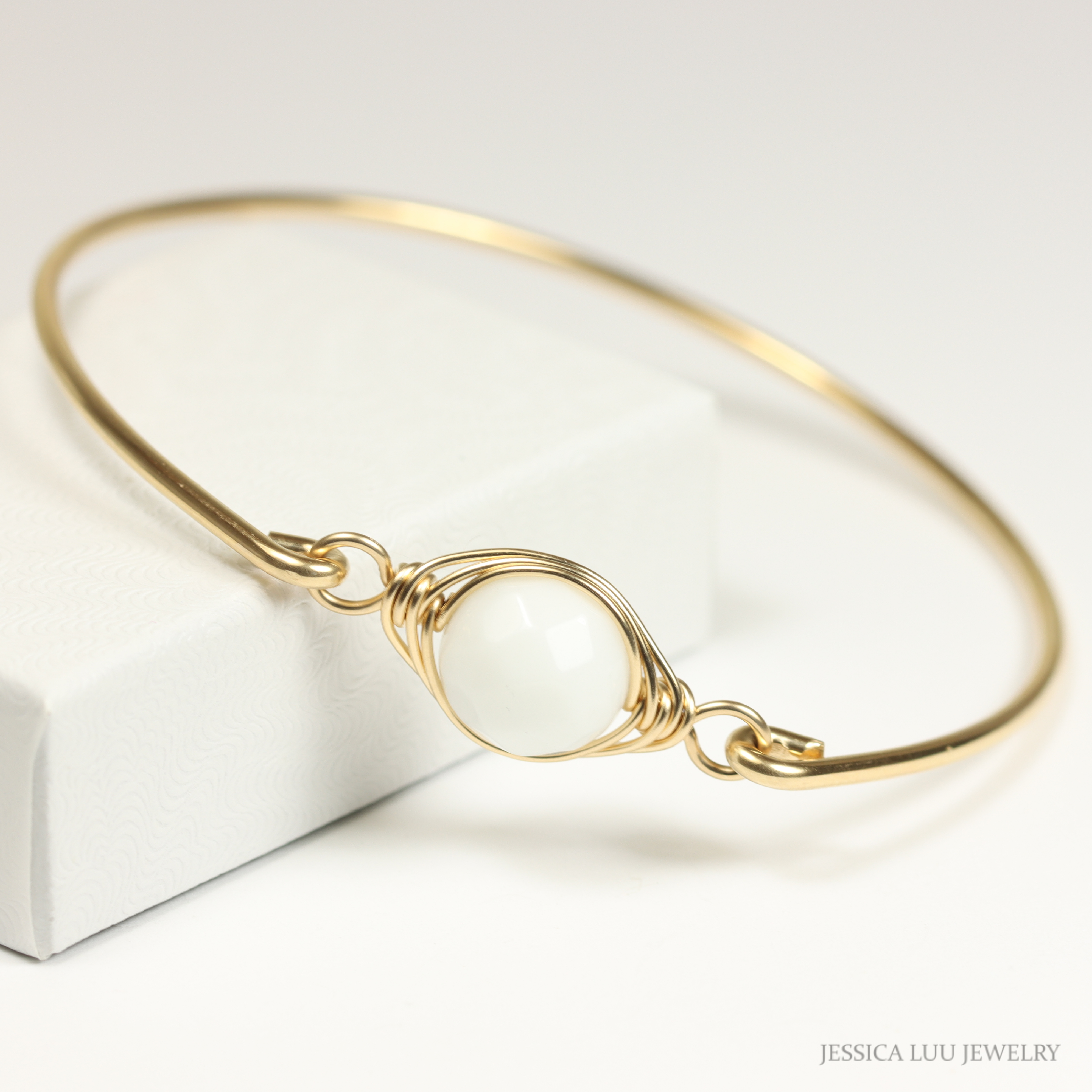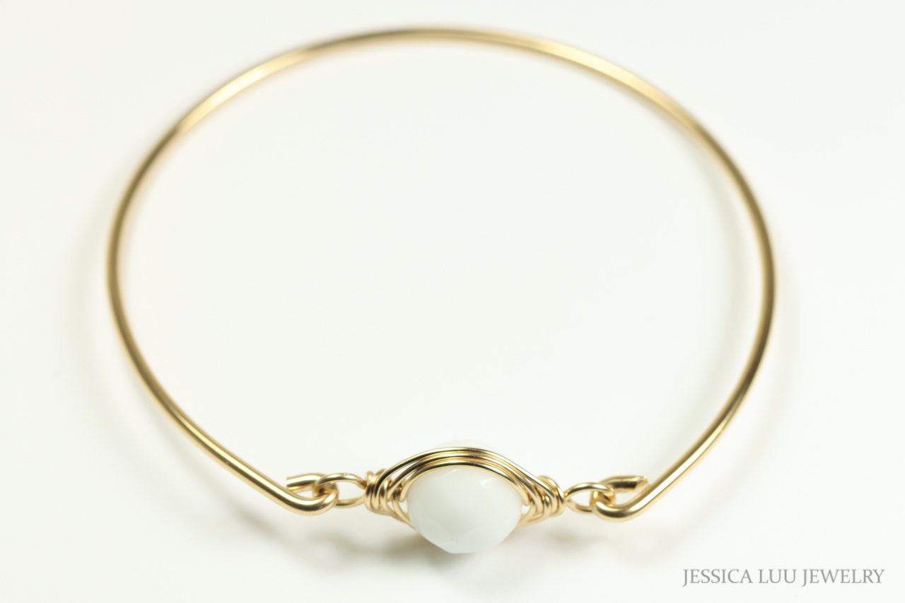 This elegant bangle bracelet is a timeless accessory that will elevate any outfit. Crafted with 14K yellow or rose gold filled metal, it features a stunning 10mm faceted white alabaster gemstone solitaire set in an intricate wire-wrapped design. The sleek and minimalist style allows the natural beauty of the alabaster to take center stage. With its comfortable slide-on design, this handmade bracelet by Jessica Luu Jewelry is both stylish and practical for everyday wear. Add a touch of sophistication to your look with this versatile piece that can be dressed up or down. Embrace classic elegance with this exquisite bangle bracelet.